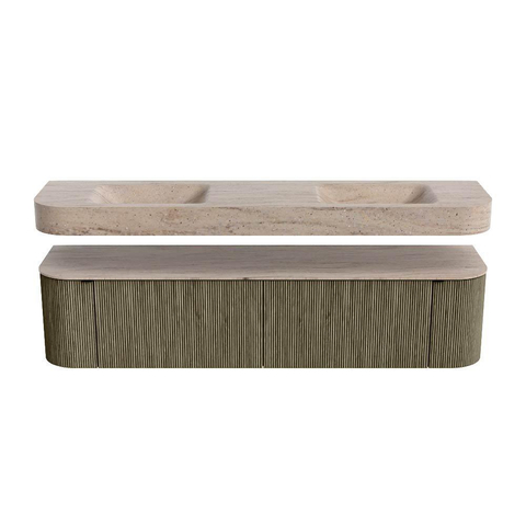 Boven het meubel zweeft een bijpassende, vrij hangende wastafel met afgeronde hoeken – perfect afgestemd op de vorm van de kast. De wastafel is uitgevoerd in Solid Surface en volgt subtiel de lijnen van het onderliggende meubel, waardoor een harmonieus geheel ontstaat. Het Solid Surface topblad vormt een sterke, onderhoudsvriendelijke basis en maakt de combinatie compleet.