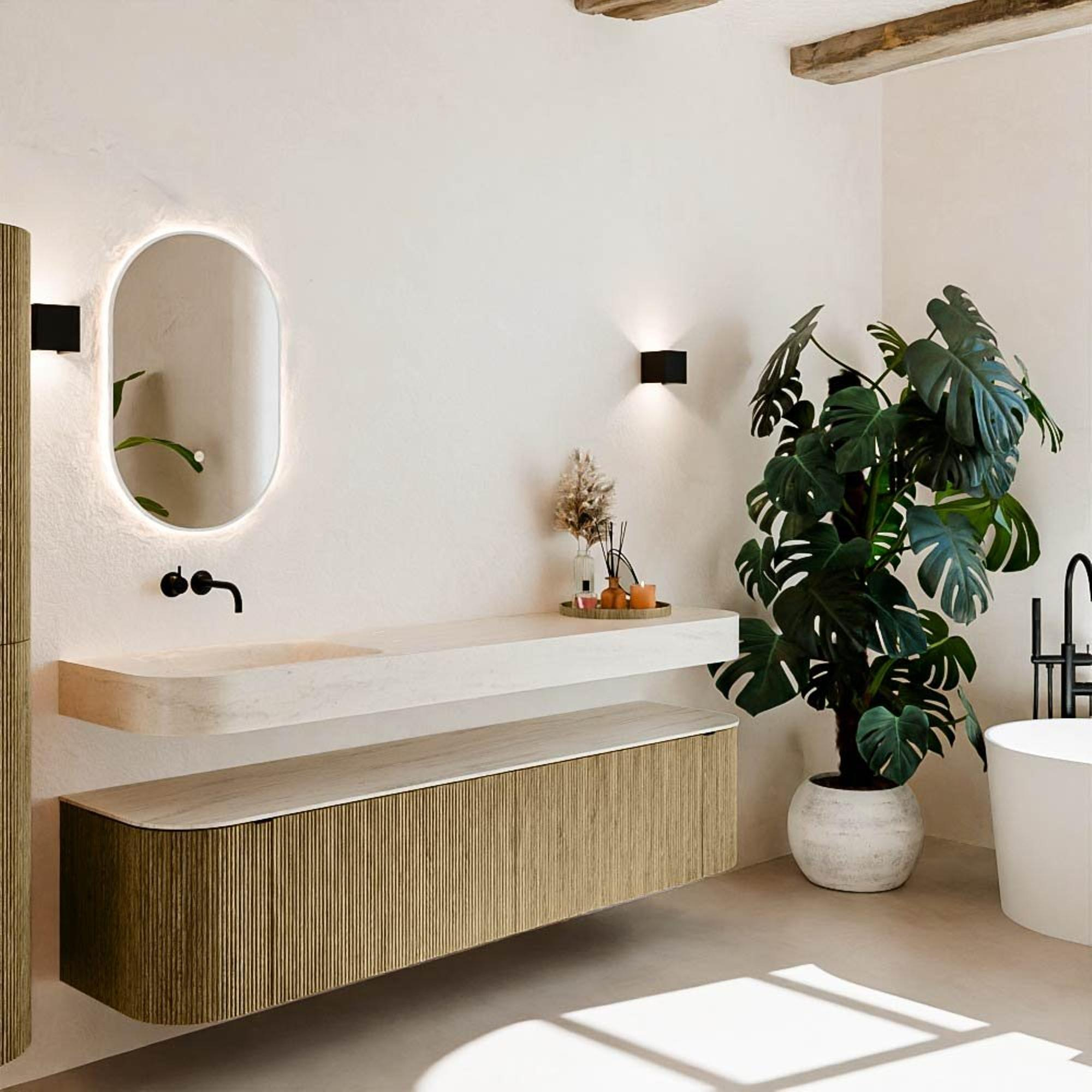 Natuurlijke materialen in warme tinten. De verticale ribbels brengen ritme en textuur in het ontwerp, terwijl het eikenhout zorgt voor een warme, ambachtelijke uitstraling. Kies uit 5 houttinten OAK, WALNUT, DUSK, SHADOW en RUBY zorgvuldig geselecteerde houtkleuren om zowel moderne als klassieke badkamers te verrijken.