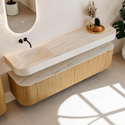Boven het meubel zweeft een bijpassende, vrij hangende wastafel met afgeronde hoeken – perfect afgestemd op de vorm van de kast. De wastafel is uitgevoerd in Solid Surface en volgt subtiel de lijnen van het onderliggende meubel, waardoor een harmonieus geheel ontstaat. Het Solid Surface topblad vormt een sterke, onderhoudsvriendelijke basis en maakt de combinatie compleet.