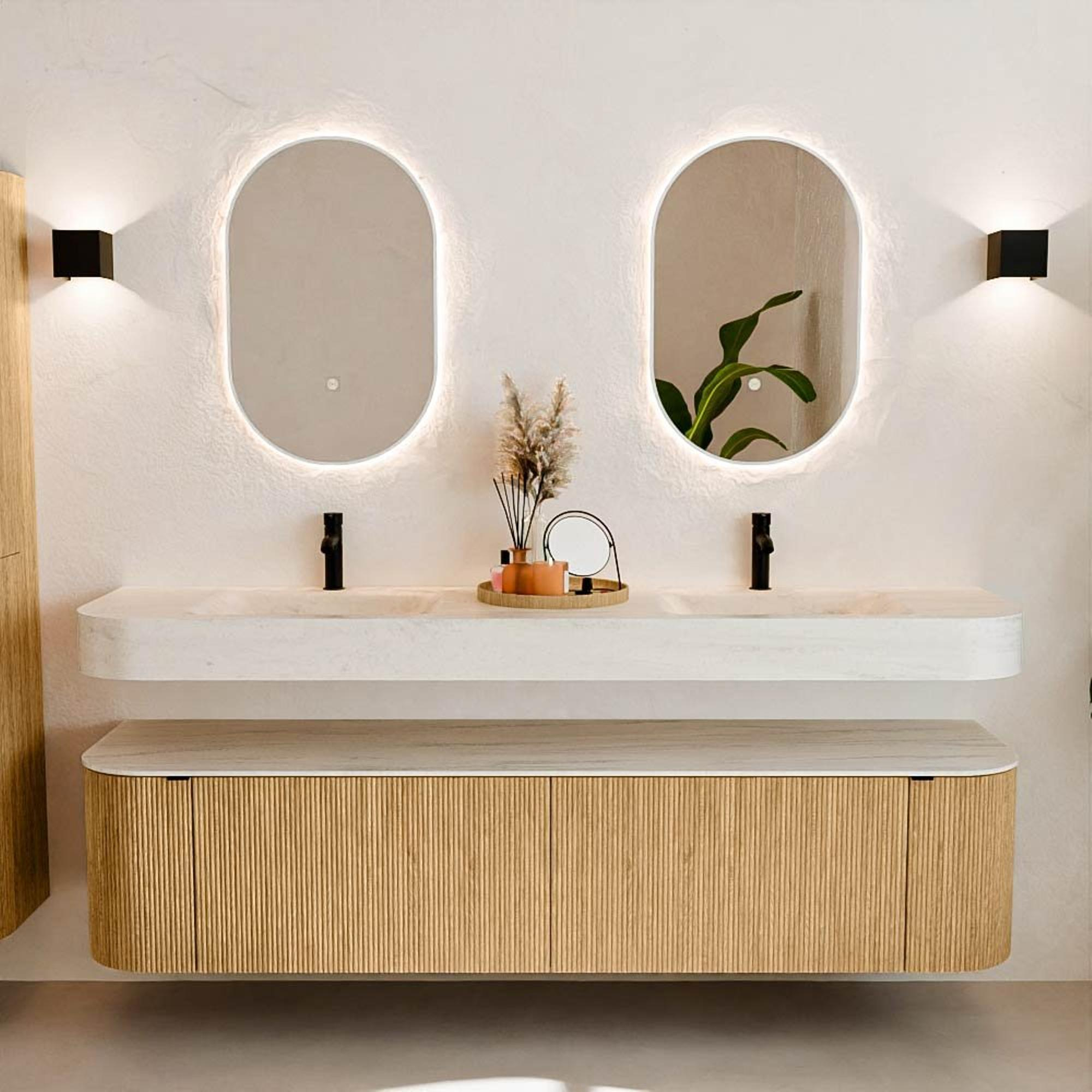 Natuurlijke materialen in warme tinten. De verticale ribbels brengen ritme en textuur in het ontwerp, terwijl het eikenhout zorgt voor een warme, ambachtelijke uitstraling. Kies uit 5 houttinten OAK, WALNUT, DUSK, SHADOW en RUBY zorgvuldig geselecteerde houtkleuren om zowel moderne als klassieke badkamers te verrijken.