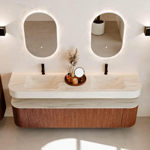 MONDIAZ THOR-DLUX 190cm badmeubel ronding links + rechts kleur Ruby met 2 lades en 2 deuren. Vrijhangende wastafel CLOUD Dubbel 2 kraangaten kleur Meli.