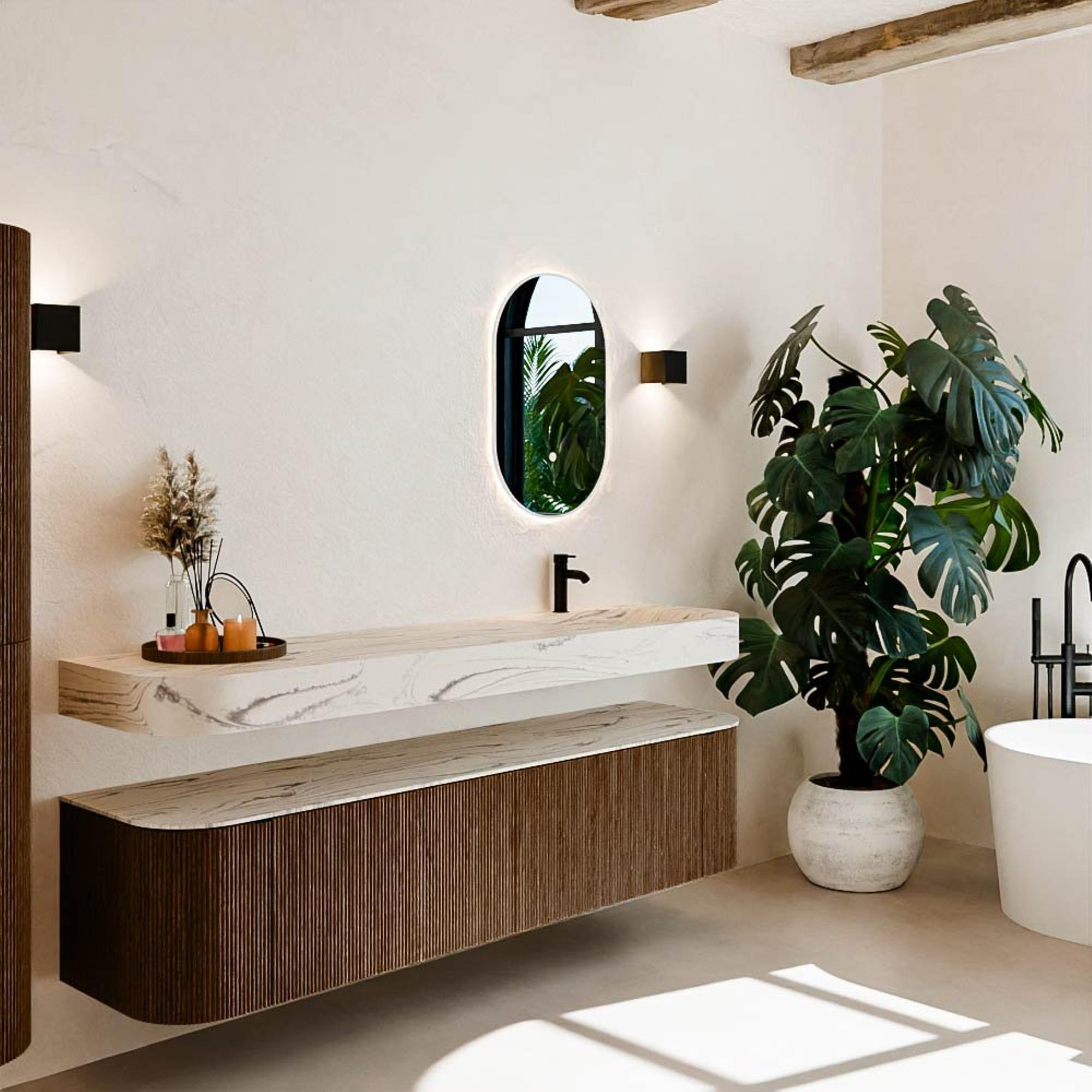 Natuurlijke materialen in warme tinten. De verticale ribbels brengen ritme en textuur in het ontwerp, terwijl het eikenhout zorgt voor een warme, ambachtelijke uitstraling. Kies uit 5 houttinten OAK, WALNUT, DUSK, SHADOW en RUBY zorgvuldig geselecteerde houtkleuren om zowel moderne als klassieke badkamers te verrijken.