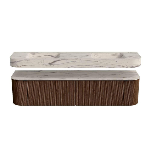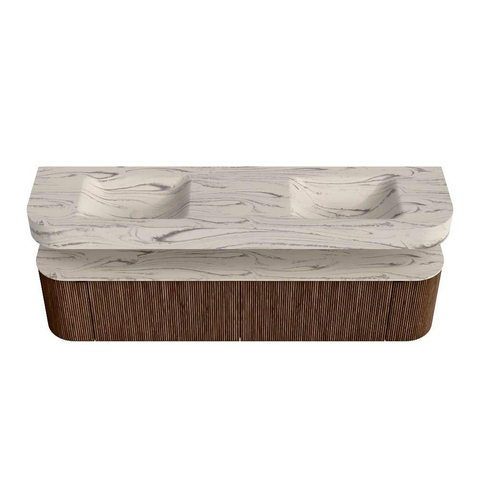 MONDIAZ THOR-DLUX 190cm badmeubel ronding links + rechts kleur Walnut met 2 lades en 2 deuren. Vrijhangende wastafel CLOUD Dubbel 2 kraangaten kleur Nata.