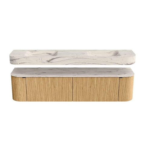 MONDIAZ THOR-DLUX 190cm badmeubel ronding links + rechts kleur Oak met 2 lades en 2 deuren. Vrijhangende wastafel CLOUD Dubbel 2 kraangaten kleur Nata.