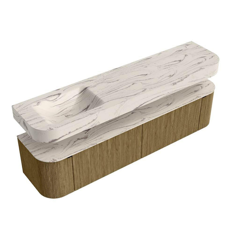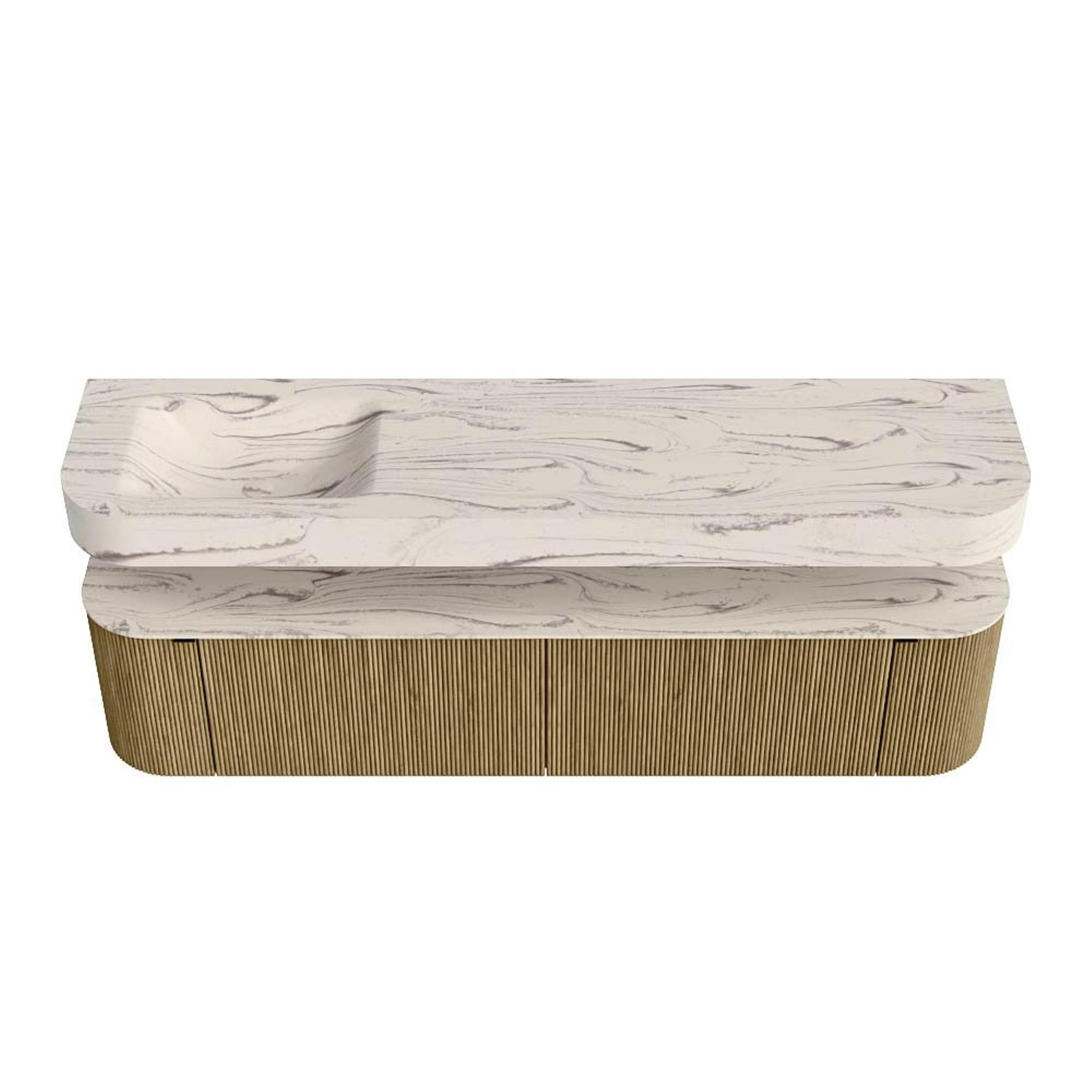 Boven het meubel zweeft een bijpassende, vrij hangende wastafel met afgeronde hoeken – perfect afgestemd op de vorm van de kast. De wastafel is uitgevoerd in Solid Surface en volgt subtiel de lijnen van het onderliggende meubel, waardoor een harmonieus geheel ontstaat. Het Solid Surface topblad vormt een sterke, onderhoudsvriendelijke basis en maakt de combinatie compleet.