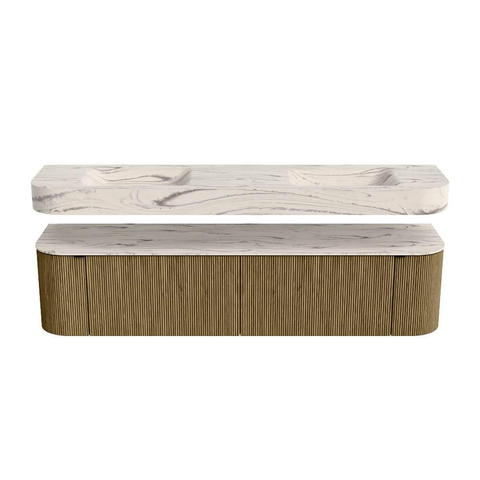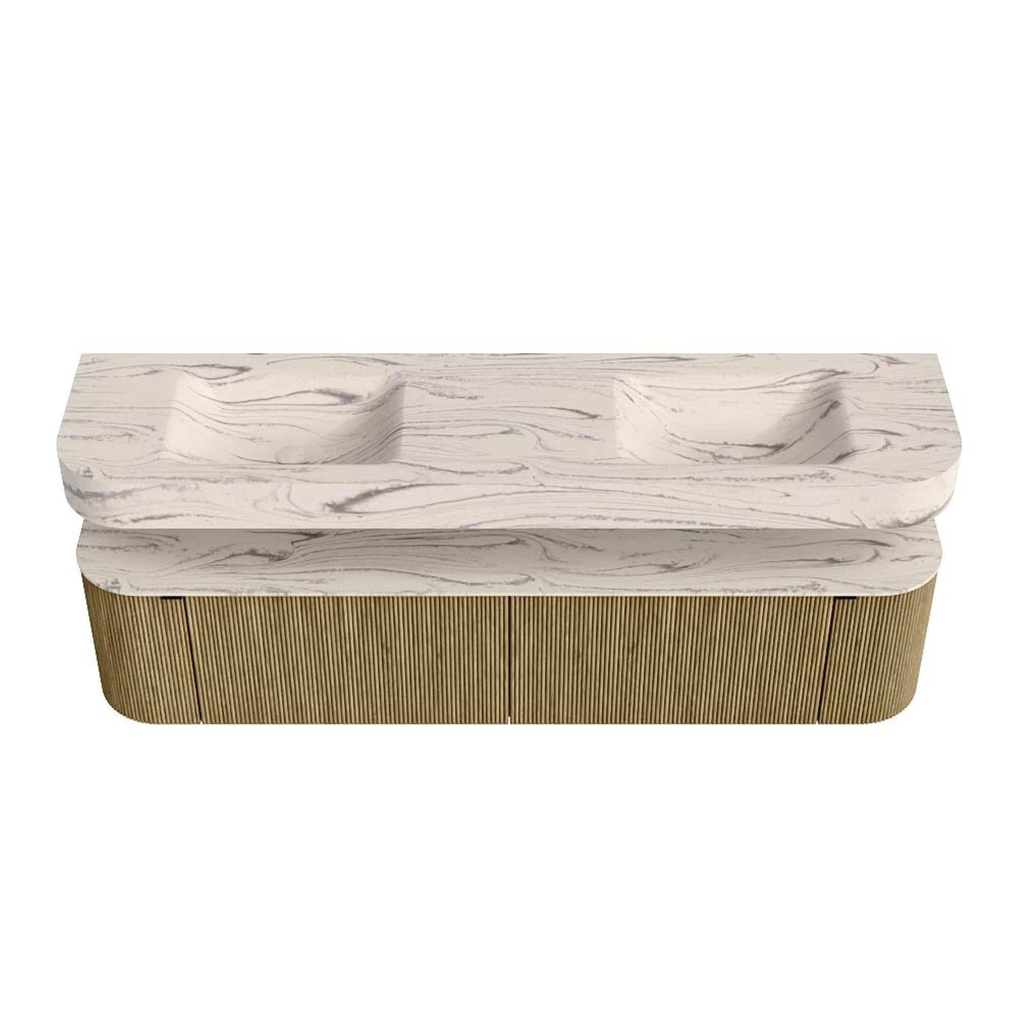 MONDIAZ THOR-DLUX 190cm badmeubel ronding links + rechts kleur Dusk met 2 lades en 2 deuren. Vrijhangende wastafel CLOUD Dubbel 2 kraangaten kleur Nata.