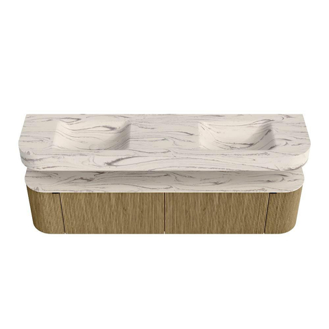 Boven het meubel zweeft een bijpassende, vrij hangende wastafel met afgeronde hoeken – perfect afgestemd op de vorm van de kast. De wastafel is uitgevoerd in Solid Surface en volgt subtiel de lijnen van het onderliggende meubel, waardoor een harmonieus geheel ontstaat. Het Solid Surface topblad vormt een sterke, onderhoudsvriendelijke basis en maakt de combinatie compleet.