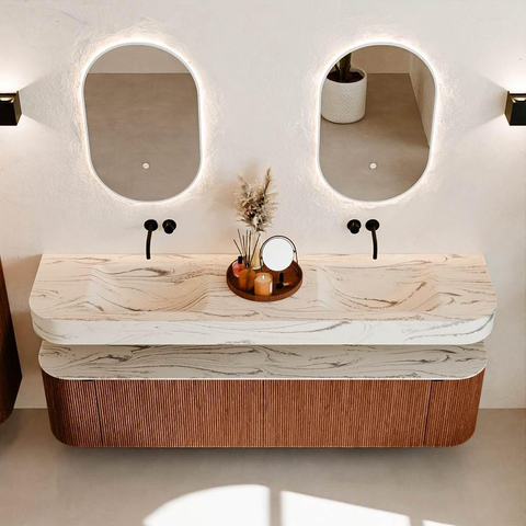 MONDIAZ THOR-DLUX 190cm badmeubel ronding links + rechts kleur Ruby met 2 lades en 2 deuren. Vrijhangende wastafel CLOUD Dubbel zonder kraangat kleur Nata.
