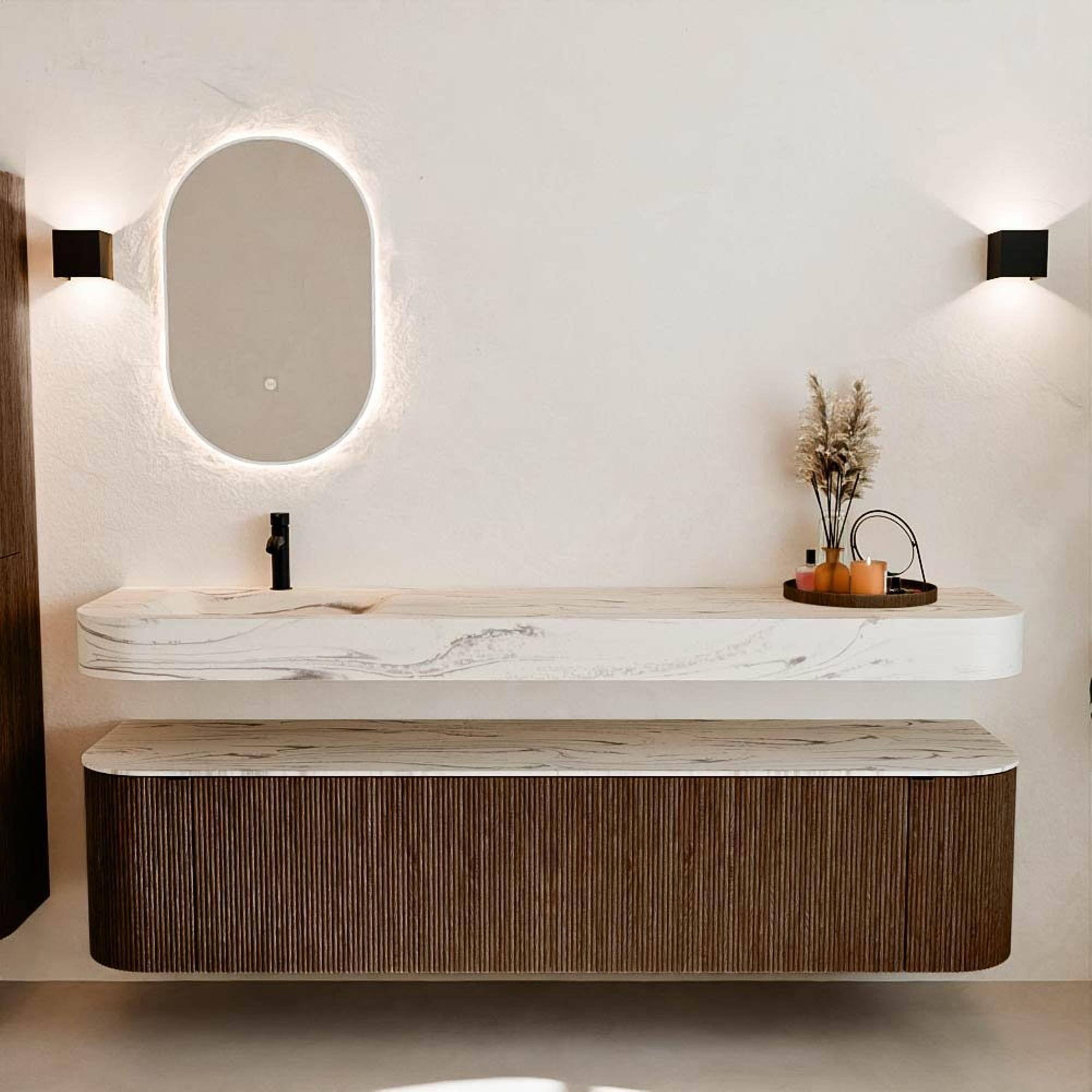 MONDIAZ THOR-DLUX 190cm badmeubel ronding links + rechts kleur Walnut met 2 lades en 2 deuren. Vrijhangende wastafel CLOUD Links 1 kraangat kleur Nata.
