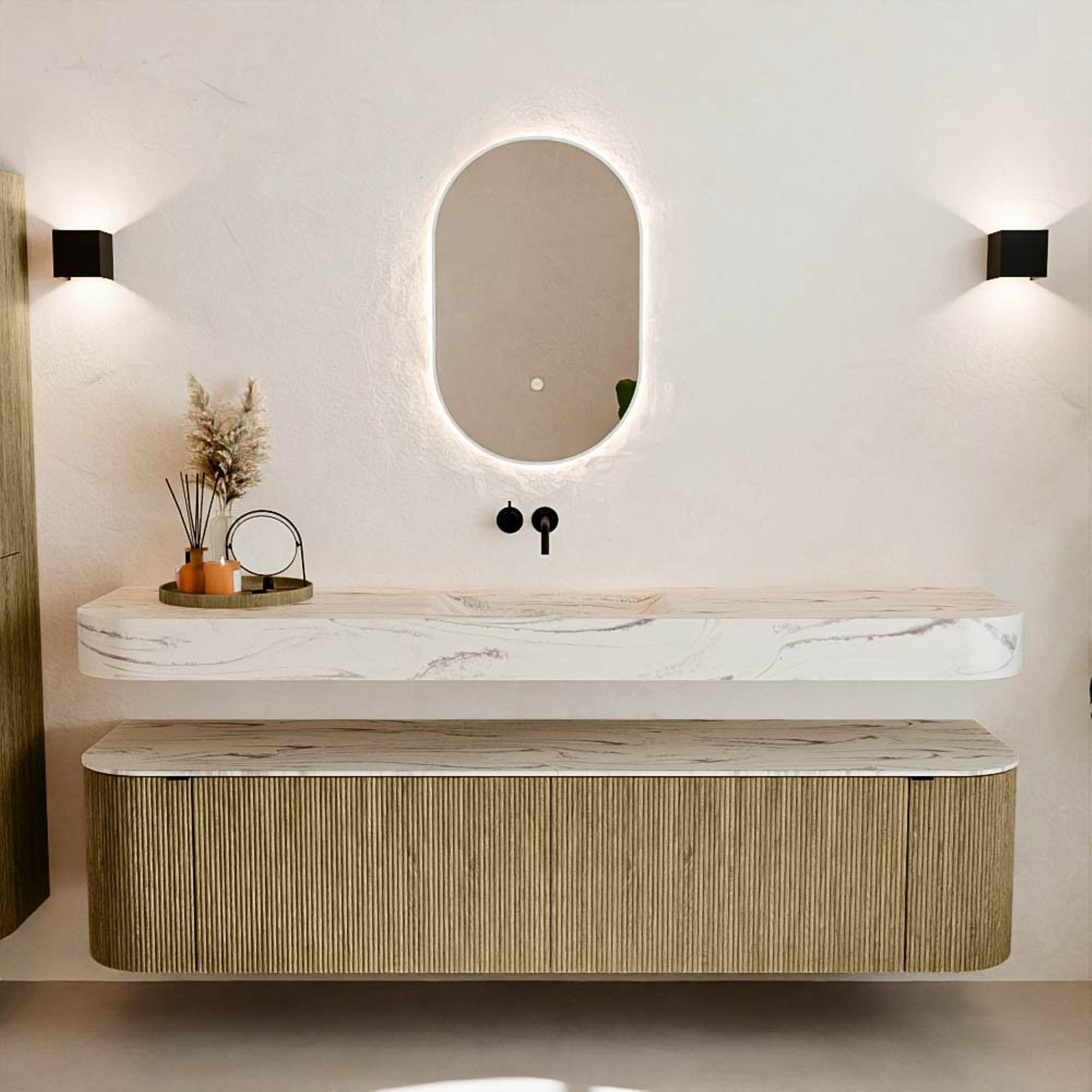 Natuurlijke materialen in warme tinten. De verticale ribbels brengen ritme en textuur in het ontwerp, terwijl het eikenhout zorgt voor een warme, ambachtelijke uitstraling. Kies uit 5 houttinten OAK, WALNUT, DUSK, SHADOW en RUBY zorgvuldig geselecteerde houtkleuren om zowel moderne als klassieke badkamers te verrijken.