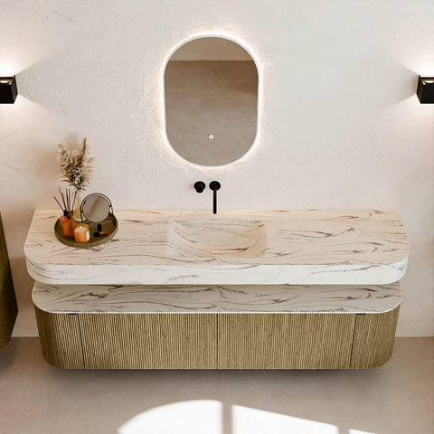Boven het meubel zweeft een bijpassende, vrij hangende wastafel met afgeronde hoeken – perfect afgestemd op de vorm van de kast. De wastafel is uitgevoerd in Solid Surface en volgt subtiel de lijnen van het onderliggende meubel, waardoor een harmonieus geheel ontstaat. Het Solid Surface topblad vormt een sterke, onderhoudsvriendelijke basis en maakt de combinatie compleet.