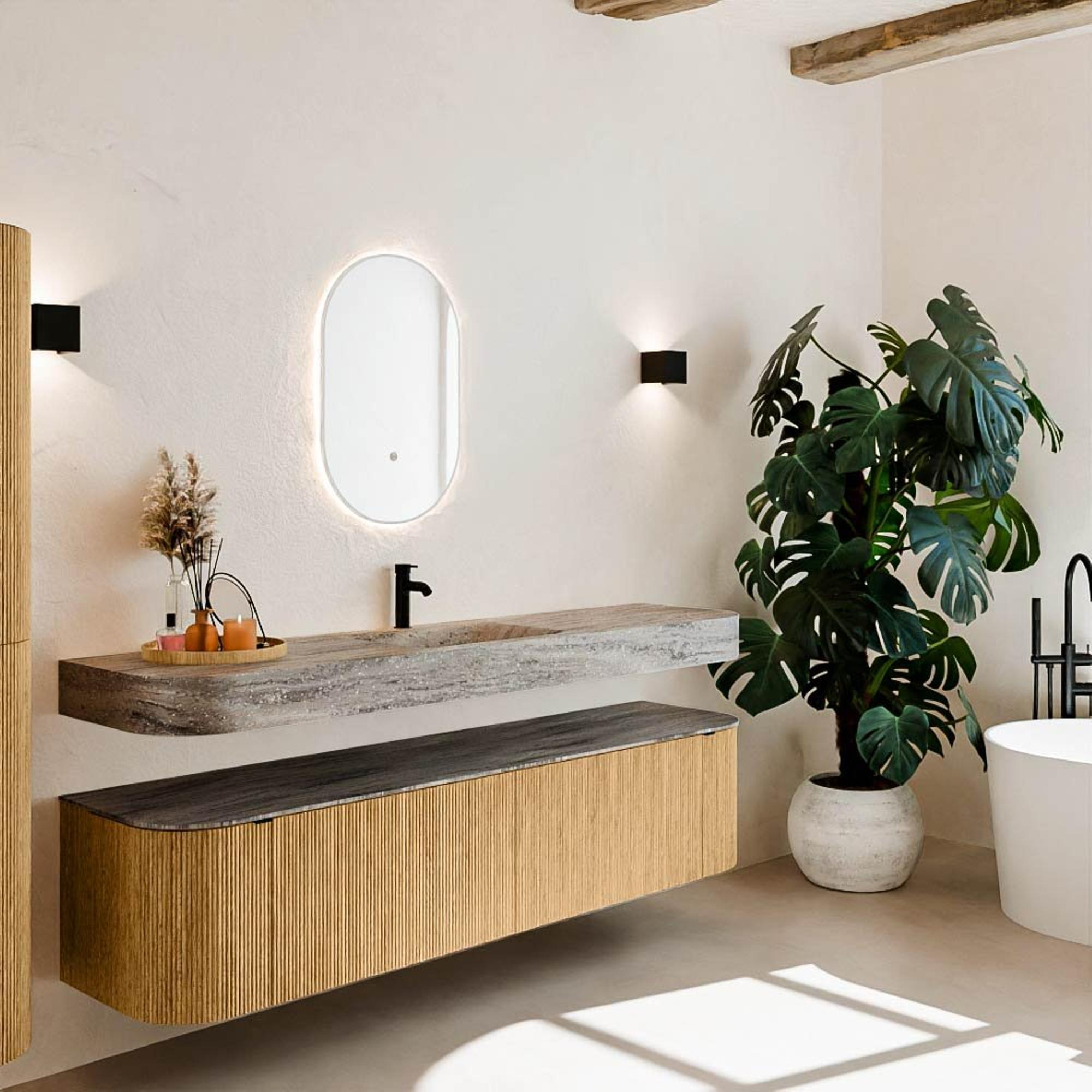 Natuurlijke materialen in warme tinten. De verticale ribbels brengen ritme en textuur in het ontwerp, terwijl het eikenhout zorgt voor een warme, ambachtelijke uitstraling. Kies uit 5 houttinten OAK, WALNUT, DUSK, SHADOW en RUBY zorgvuldig geselecteerde houtkleuren om zowel moderne als klassieke badkamers te verrijken.