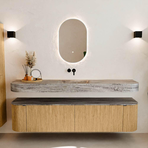 Natuurlijke materialen in warme tinten. De verticale ribbels brengen ritme en textuur in het ontwerp, terwijl het eikenhout zorgt voor een warme, ambachtelijke uitstraling. Kies uit 5 houttinten OAK, WALNUT, DUSK, SHADOW en RUBY zorgvuldig geselecteerde houtkleuren om zowel moderne als klassieke badkamers te verrijken.