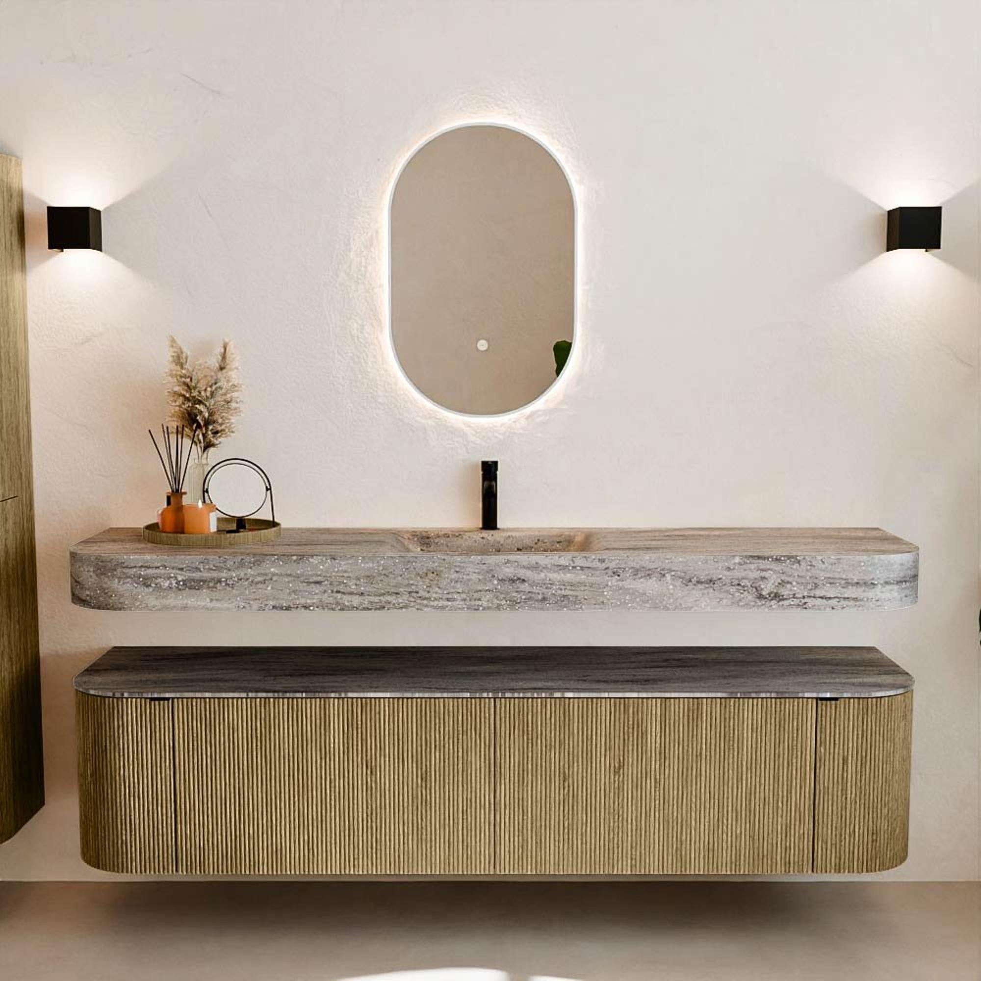 Natuurlijke materialen in warme tinten. De verticale ribbels brengen ritme en textuur in het ontwerp, terwijl het eikenhout zorgt voor een warme, ambachtelijke uitstraling. Kies uit 5 houttinten OAK, WALNUT, DUSK, SHADOW en RUBY zorgvuldig geselecteerde houtkleuren om zowel moderne als klassieke badkamers te verrijken.