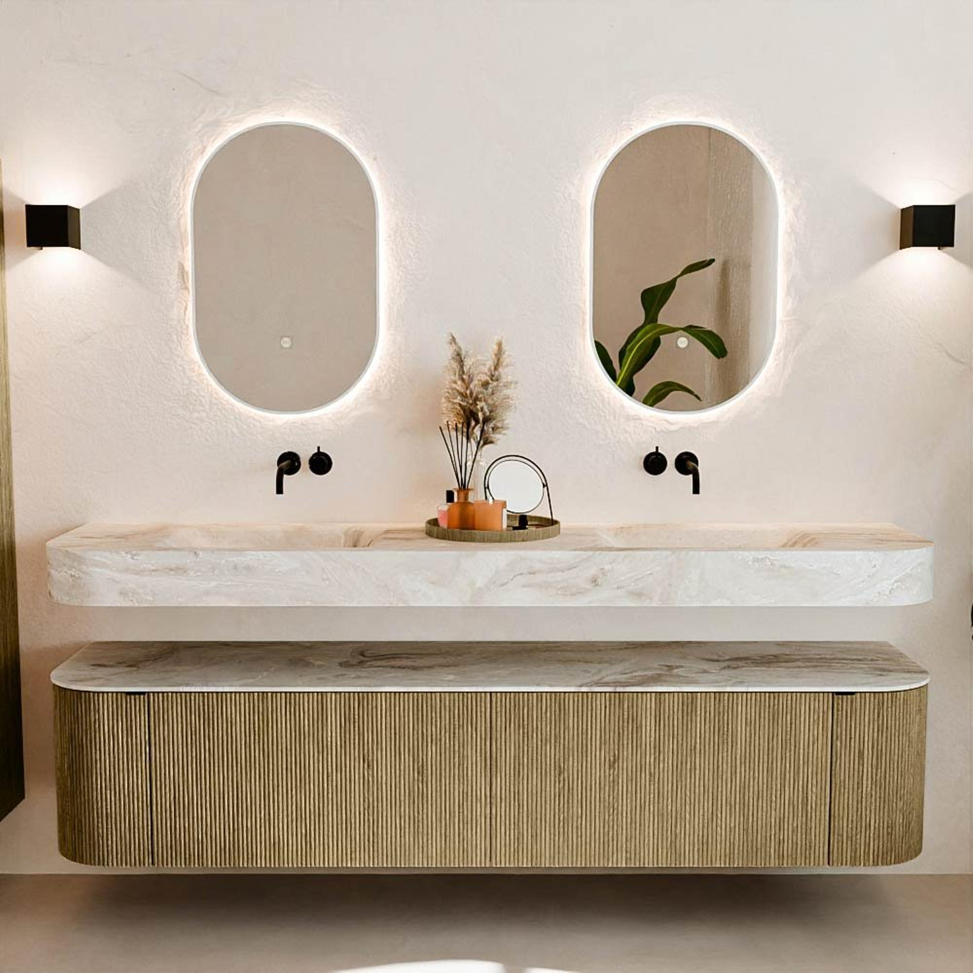 Natuurlijke materialen in warme tinten. De verticale ribbels brengen ritme en textuur in het ontwerp, terwijl het eikenhout zorgt voor een warme, ambachtelijke uitstraling. Kies uit 5 houttinten OAK, WALNUT, DUSK, SHADOW en RUBY zorgvuldig geselecteerde houtkleuren om zowel moderne als klassieke badkamers te verrijken.