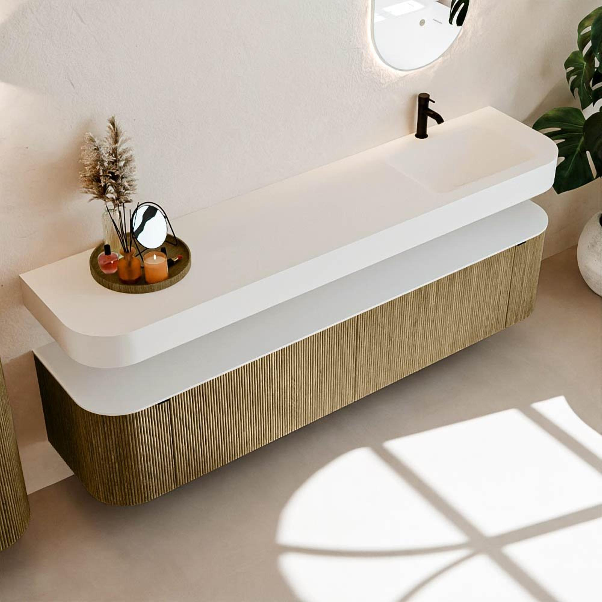 Boven het meubel zweeft een bijpassende, vrij hangende wastafel met afgeronde hoeken – perfect afgestemd op de vorm van de kast. De wastafel is uitgevoerd in Solid Surface en volgt subtiel de lijnen van het onderliggende meubel, waardoor een harmonieus geheel ontstaat. Het Solid Surface topblad vormt een sterke, onderhoudsvriendelijke basis en maakt de combinatie compleet.