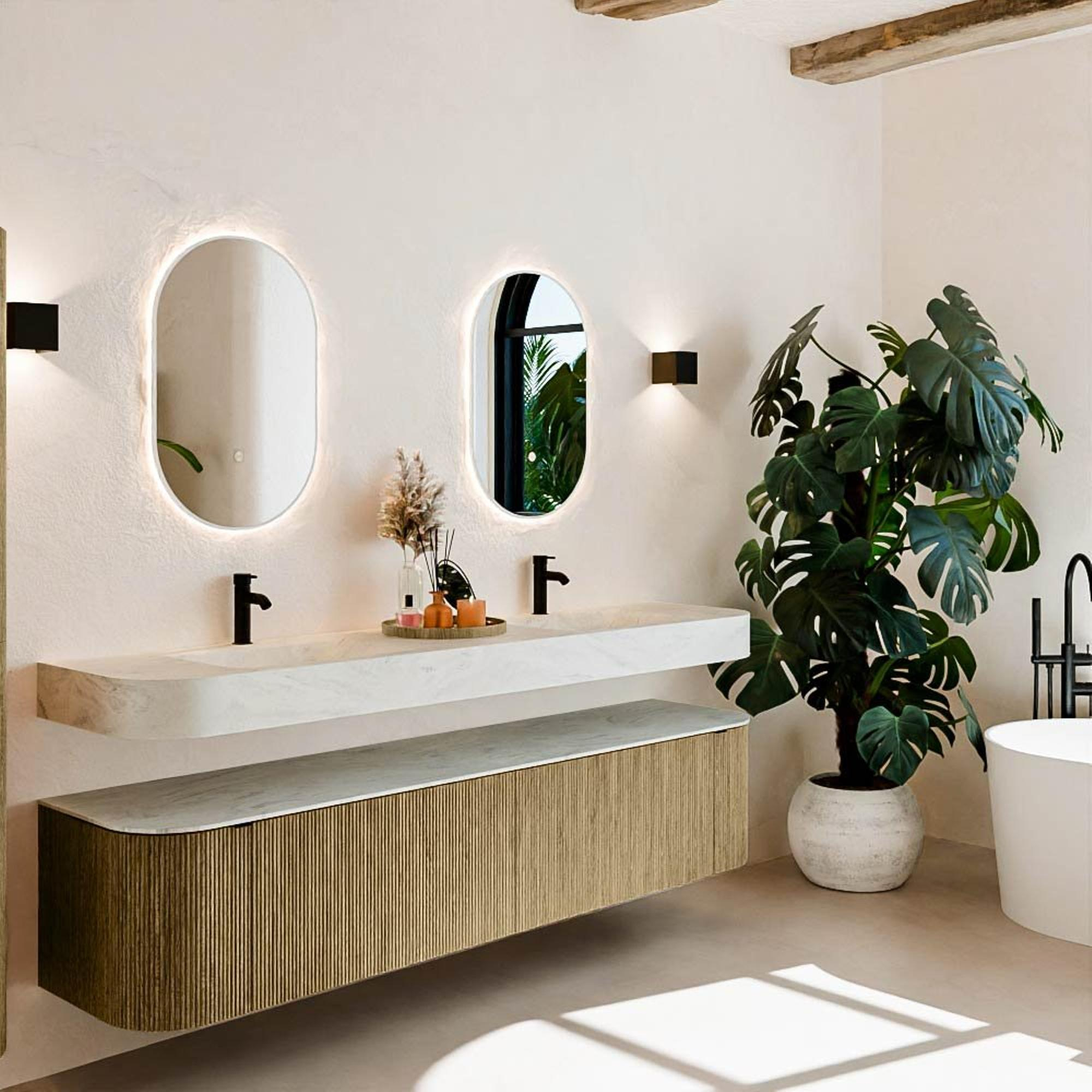 Natuurlijke materialen in warme tinten. De verticale ribbels brengen ritme en textuur in het ontwerp, terwijl het eikenhout zorgt voor een warme, ambachtelijke uitstraling. Kies uit 5 houttinten OAK, WALNUT, DUSK, SHADOW en RUBY zorgvuldig geselecteerde houtkleuren om zowel moderne als klassieke badkamers te verrijken.