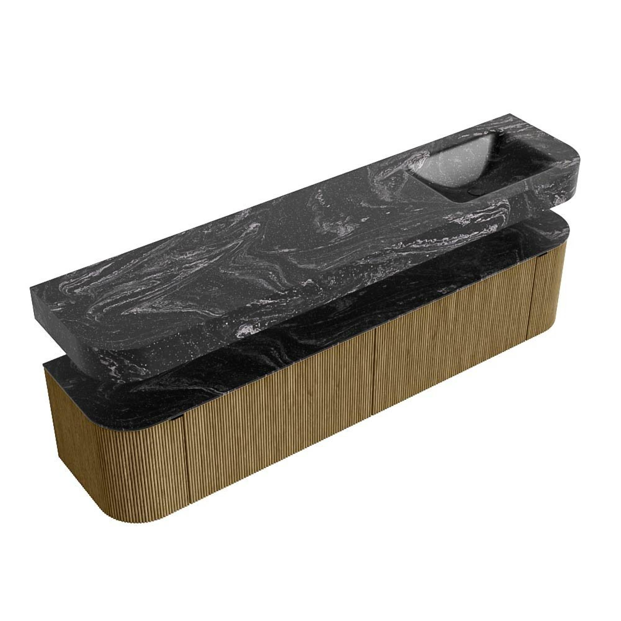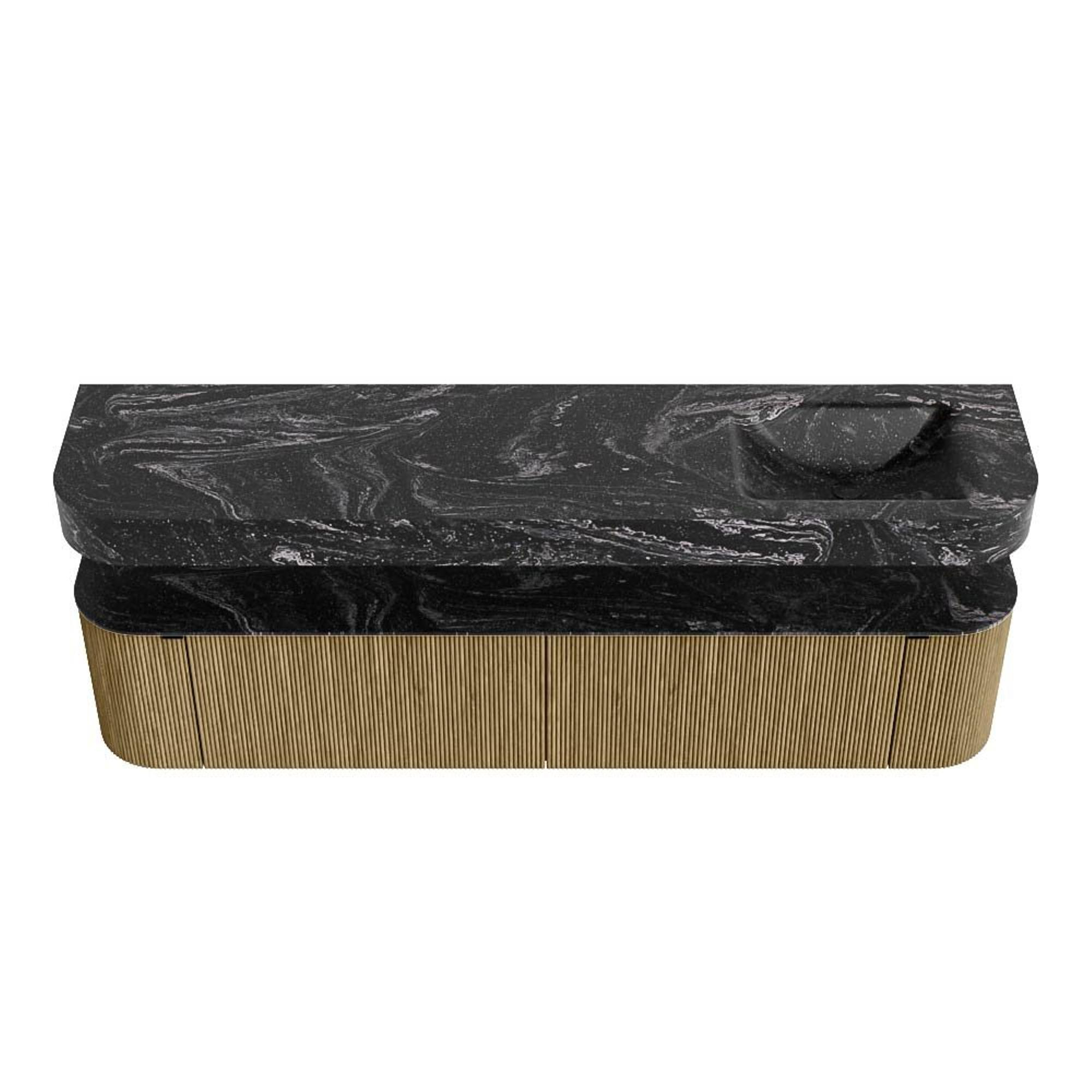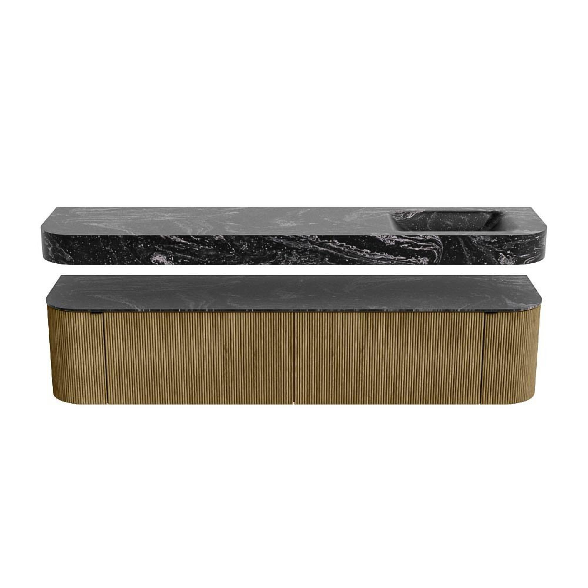 Boven het meubel zweeft een bijpassende, vrij hangende wastafel met afgeronde hoeken – perfect afgestemd op de vorm van de kast. De wastafel is uitgevoerd in Solid Surface en volgt subtiel de lijnen van het onderliggende meubel, waardoor een harmonieus geheel ontstaat. Het Solid Surface topblad vormt een sterke, onderhoudsvriendelijke basis en maakt de combinatie compleet.