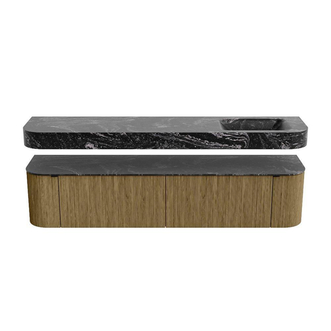 MONDIAZ THOR-DLUX 200cm badmeubel ronding links + rechts kleur Dusk met 2 lades en 2 deuren. Vrijhangende wastafel CLOUD Rechts 1 kraangat kleur Lava.