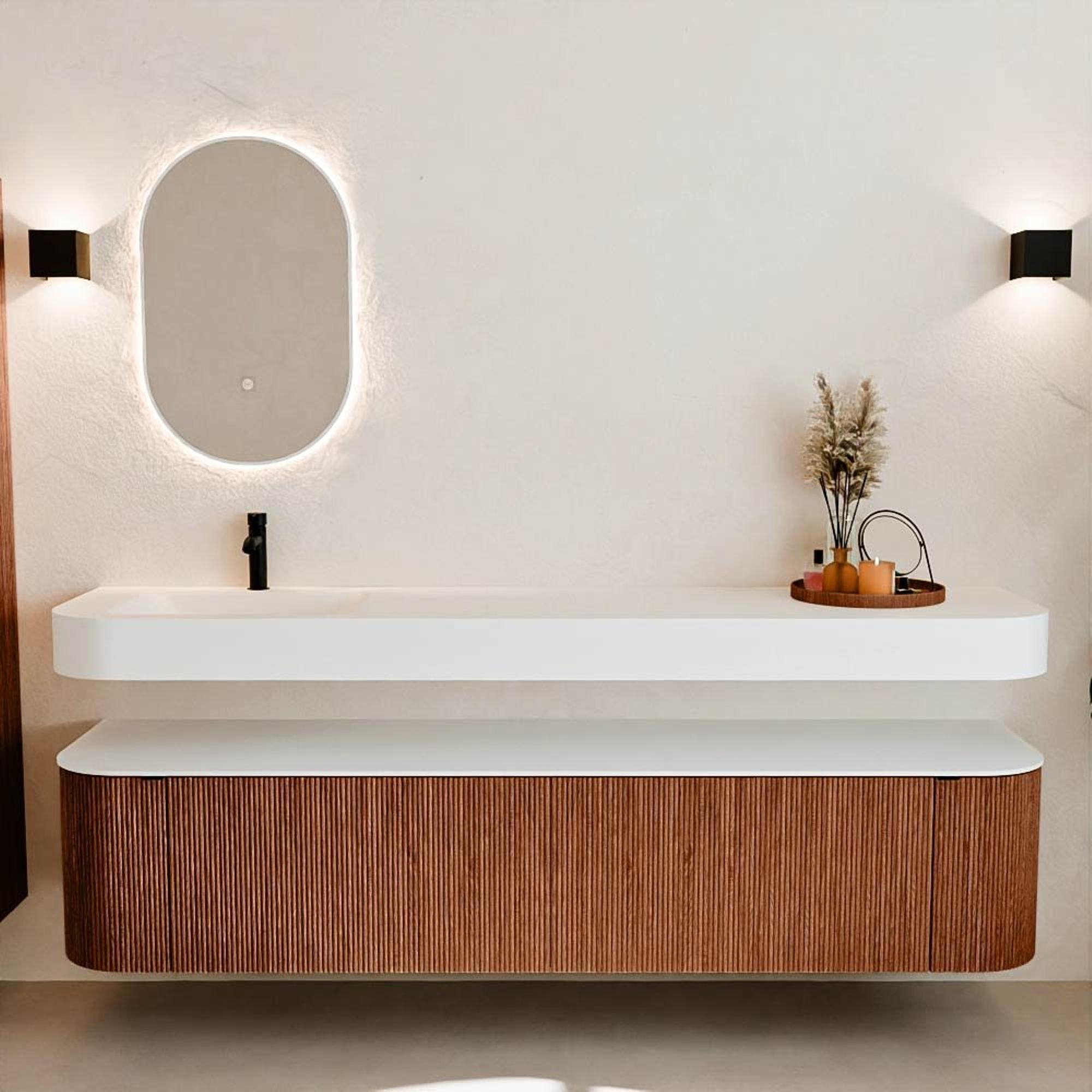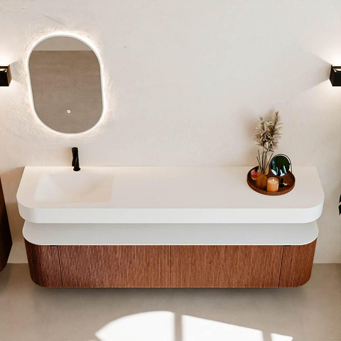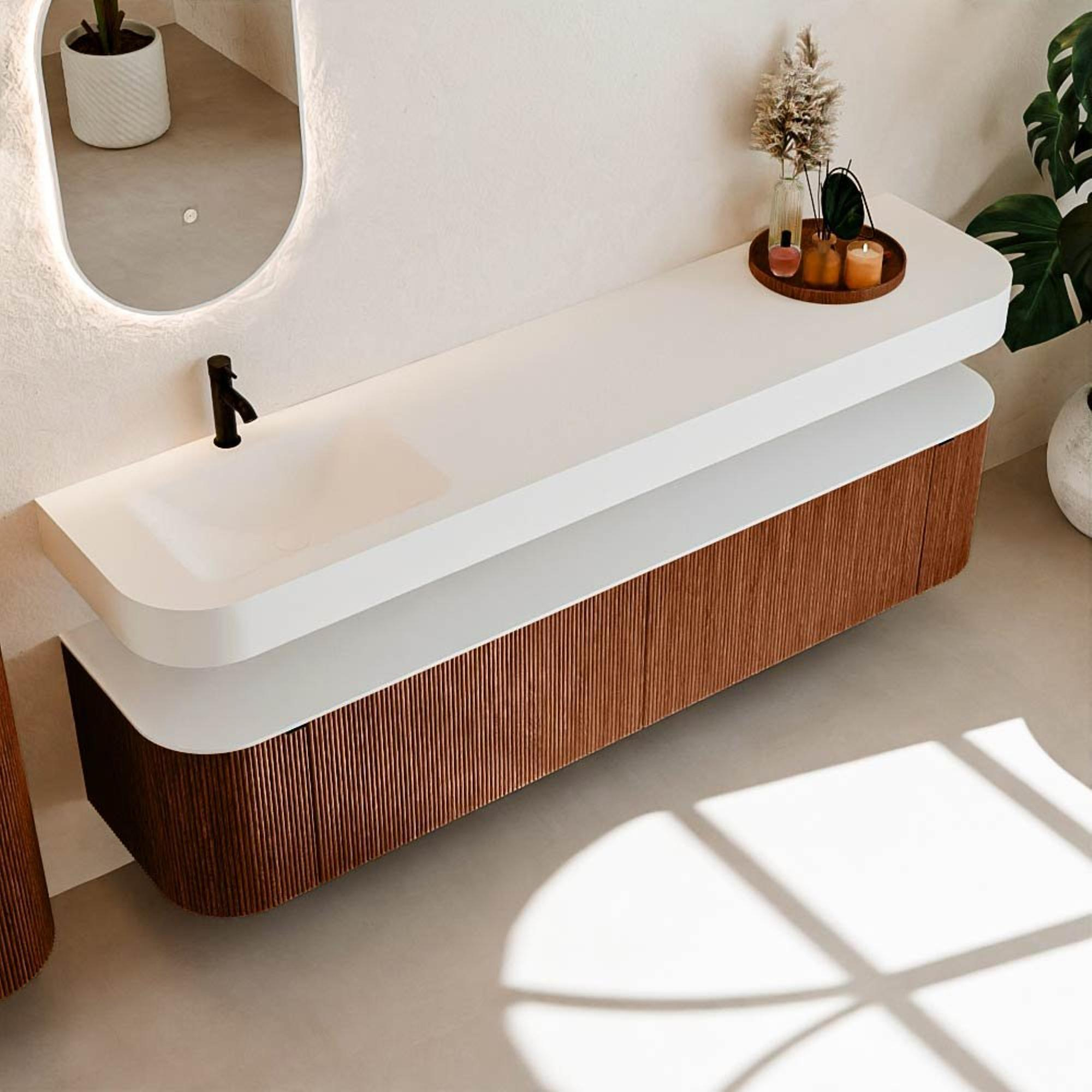 Boven het meubel zweeft een bijpassende, vrij hangende wastafel met afgeronde hoeken – perfect afgestemd op de vorm van de kast. De wastafel is uitgevoerd in Solid Surface en volgt subtiel de lijnen van het onderliggende meubel, waardoor een harmonieus geheel ontstaat. Het Solid Surface topblad vormt een sterke, onderhoudsvriendelijke basis en maakt de combinatie compleet.