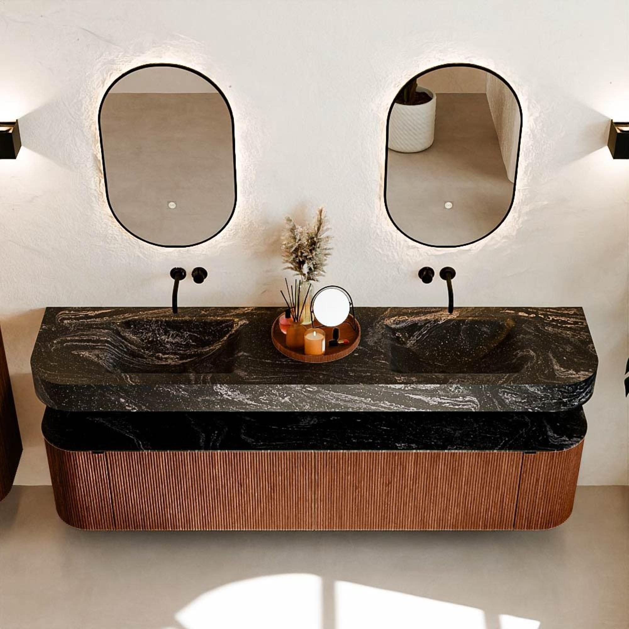 MONDIAZ THOR-DLUX 200cm badmeubel ronding links + rechts kleur Ruby met 2 lades en 2 deuren. Vrijhangende wastafel CLOUD Dubbel zonder kraangat kleur Lava.