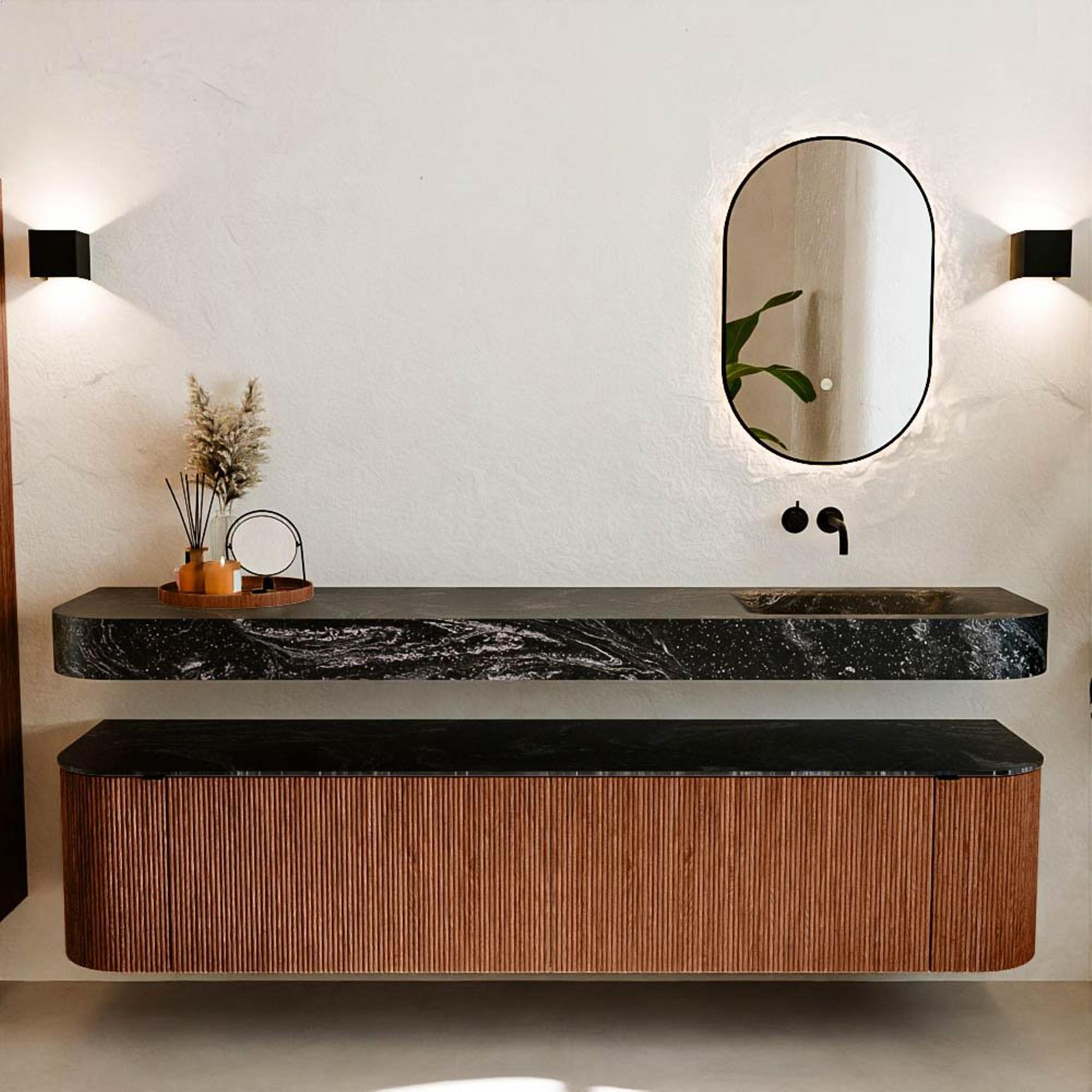 Natuurlijke materialen in warme tinten. De verticale ribbels brengen ritme en textuur in het ontwerp, terwijl het eikenhout zorgt voor een warme, ambachtelijke uitstraling. Kies uit 5 houttinten OAK, WALNUT, DUSK, SHADOW en RUBY zorgvuldig geselecteerde houtkleuren om zowel moderne als klassieke badkamers te verrijken.