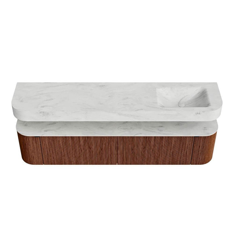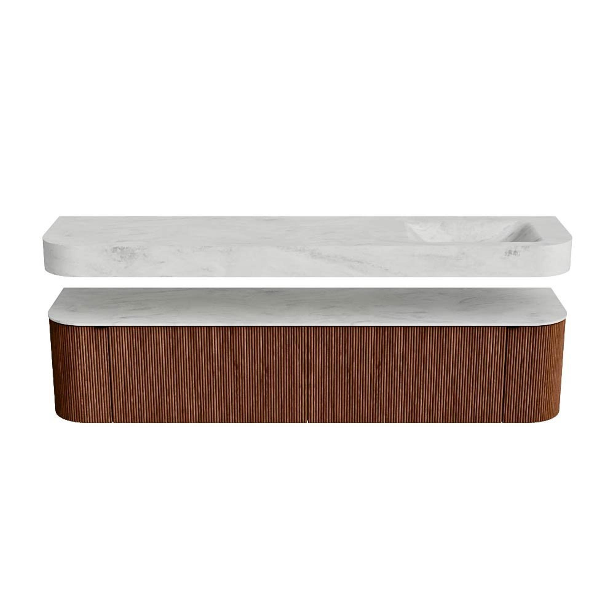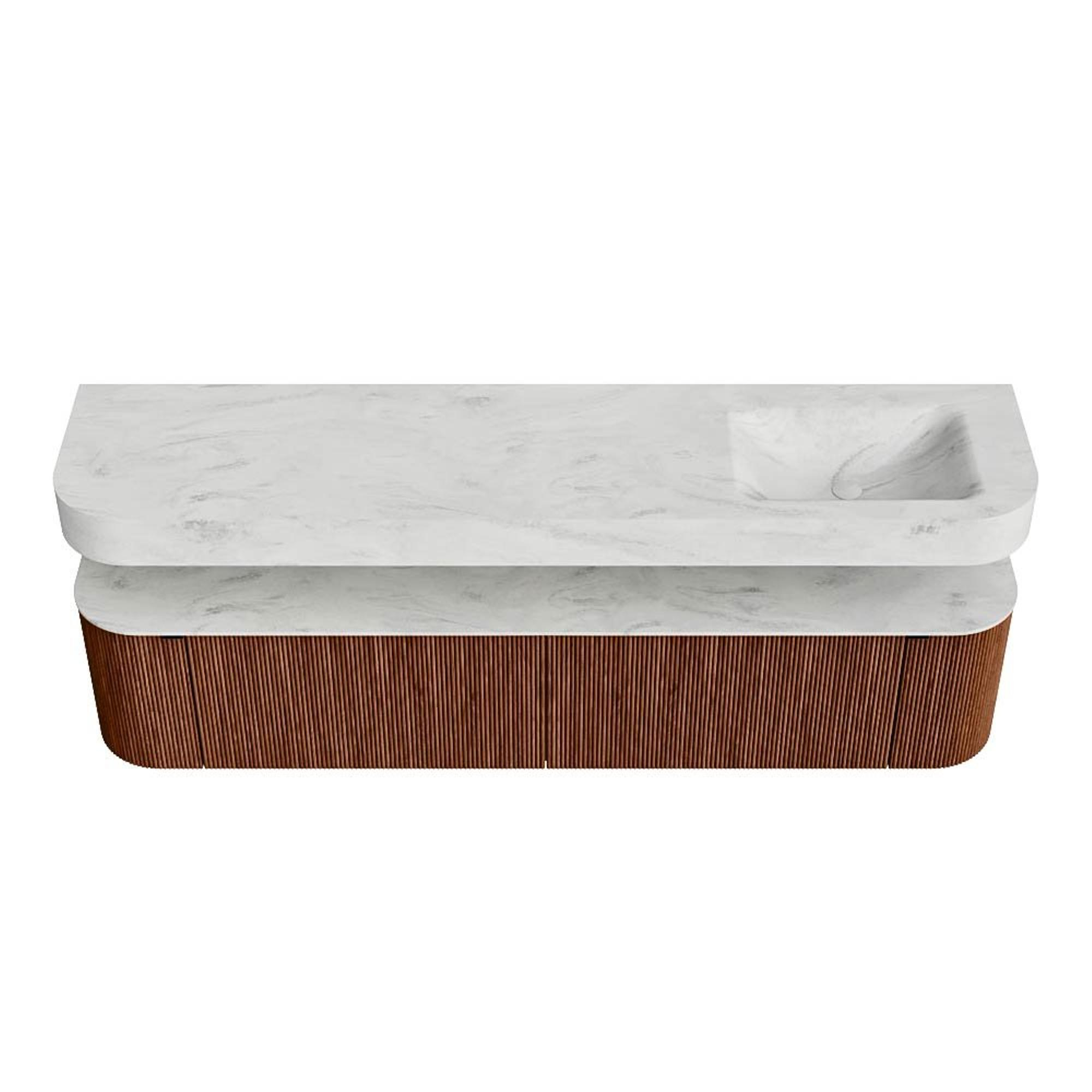 Boven het meubel zweeft een bijpassende, vrij hangende wastafel met afgeronde hoeken – perfect afgestemd op de vorm van de kast. De wastafel is uitgevoerd in Solid Surface en volgt subtiel de lijnen van het onderliggende meubel, waardoor een harmonieus geheel ontstaat. Het Solid Surface topblad vormt een sterke, onderhoudsvriendelijke basis en maakt de combinatie compleet.