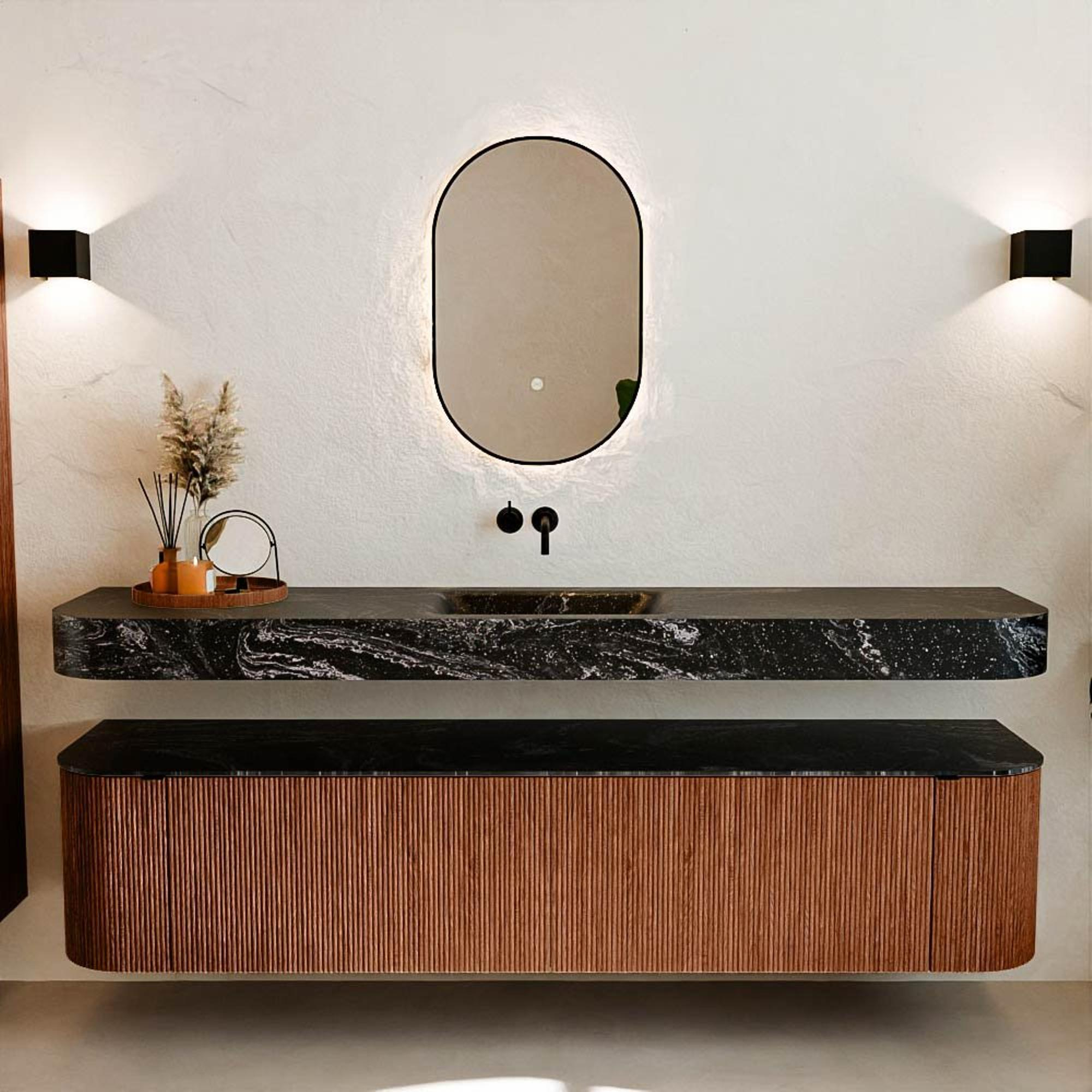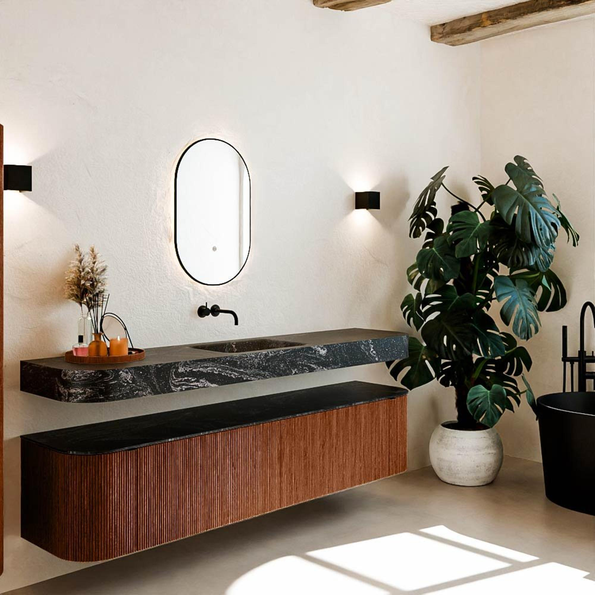 Natuurlijke materialen in warme tinten. De verticale ribbels brengen ritme en textuur in het ontwerp, terwijl het eikenhout zorgt voor een warme, ambachtelijke uitstraling. Kies uit 5 houttinten OAK, WALNUT, DUSK, SHADOW en RUBY zorgvuldig geselecteerde houtkleuren om zowel moderne als klassieke badkamers te verrijken.