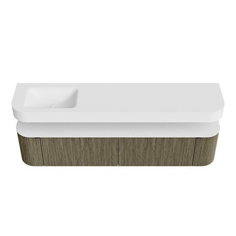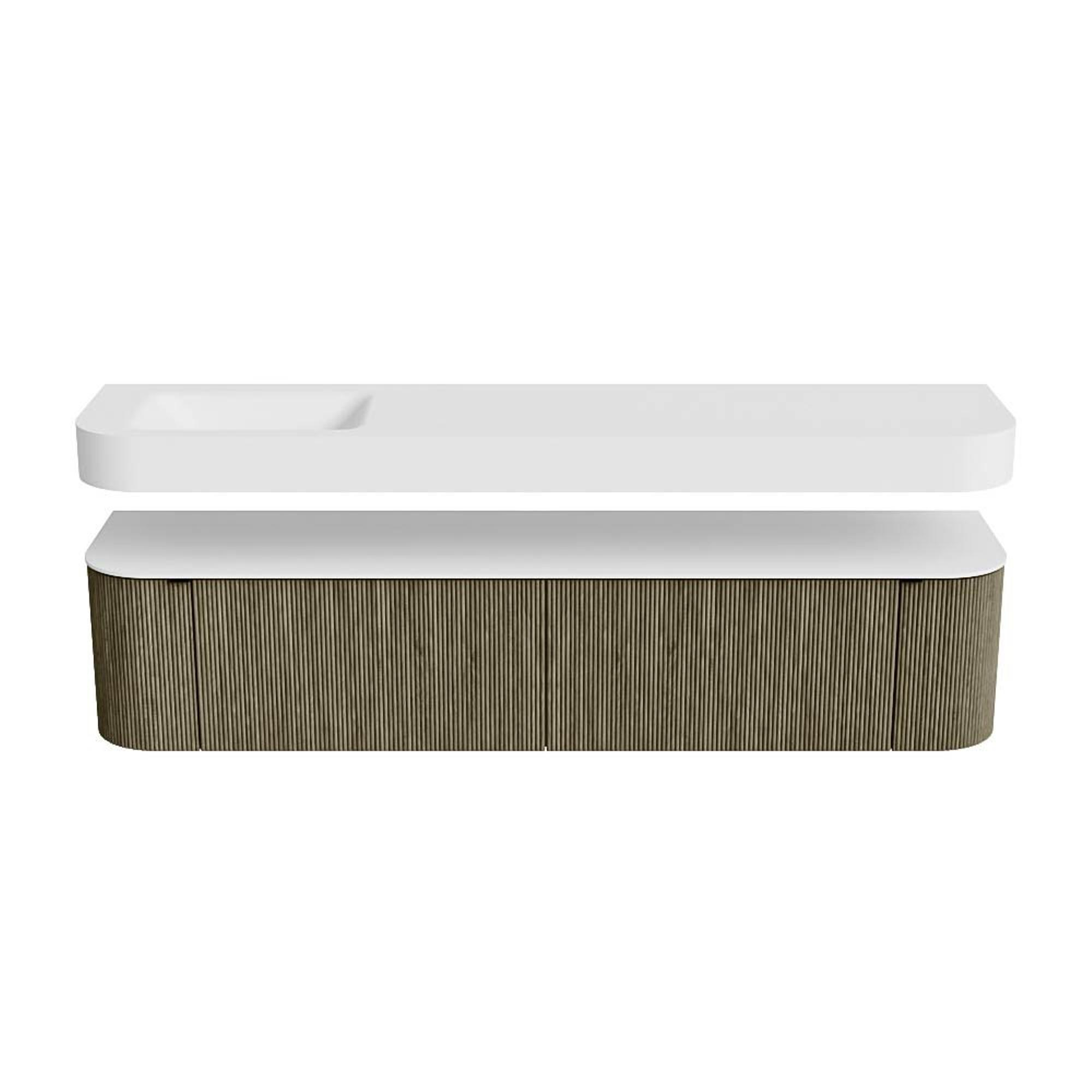Boven het meubel zweeft een bijpassende, vrij hangende wastafel met afgeronde hoeken – perfect afgestemd op de vorm van de kast. De wastafel is uitgevoerd in Solid Surface en volgt subtiel de lijnen van het onderliggende meubel, waardoor een harmonieus geheel ontstaat. Het Solid Surface topblad vormt een sterke, onderhoudsvriendelijke basis en maakt de combinatie compleet.