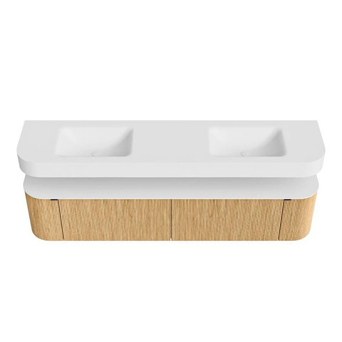 Boven het meubel zweeft een bijpassende, vrij hangende wastafel met afgeronde hoeken – perfect afgestemd op de vorm van de kast. De wastafel is uitgevoerd in Solid Surface en volgt subtiel de lijnen van het onderliggende meubel, waardoor een harmonieus geheel ontstaat. Het Solid Surface topblad vormt een sterke, onderhoudsvriendelijke basis en maakt de combinatie compleet.
