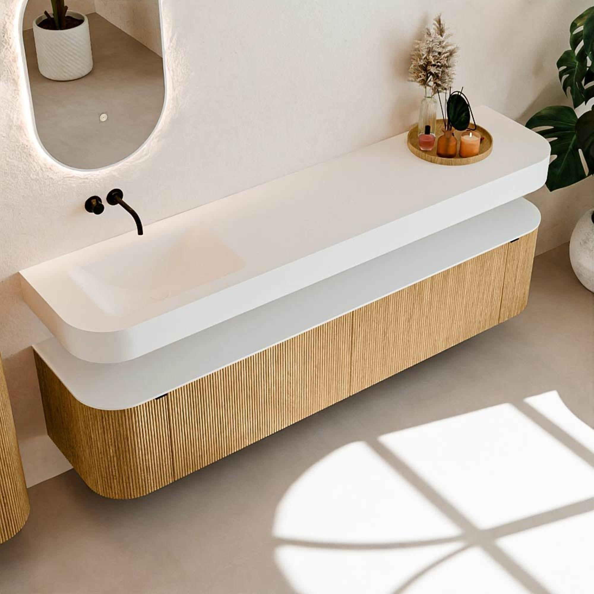 Boven het meubel zweeft een bijpassende, vrij hangende wastafel met afgeronde hoeken – perfect afgestemd op de vorm van de kast. De wastafel is uitgevoerd in Solid Surface en volgt subtiel de lijnen van het onderliggende meubel, waardoor een harmonieus geheel ontstaat. Het Solid Surface topblad vormt een sterke, onderhoudsvriendelijke basis en maakt de combinatie compleet.