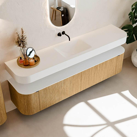 Boven het meubel zweeft een bijpassende, vrij hangende wastafel met afgeronde hoeken – perfect afgestemd op de vorm van de kast. De wastafel is uitgevoerd in Solid Surface en volgt subtiel de lijnen van het onderliggende meubel, waardoor een harmonieus geheel ontstaat. Het Solid Surface topblad vormt een sterke, onderhoudsvriendelijke basis en maakt de combinatie compleet.