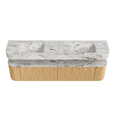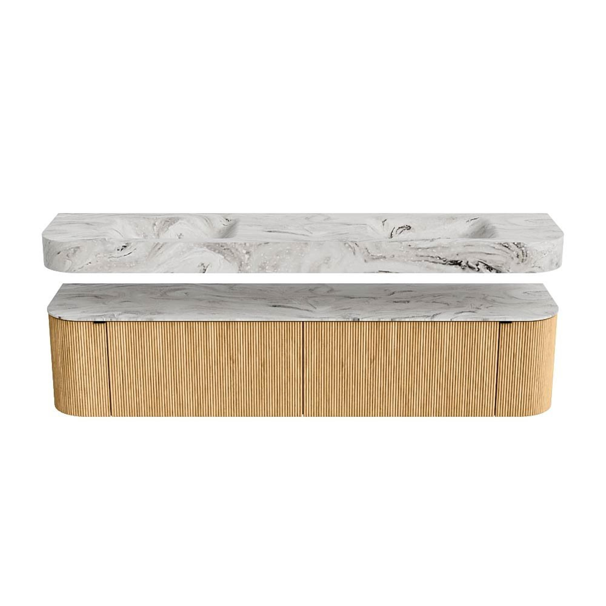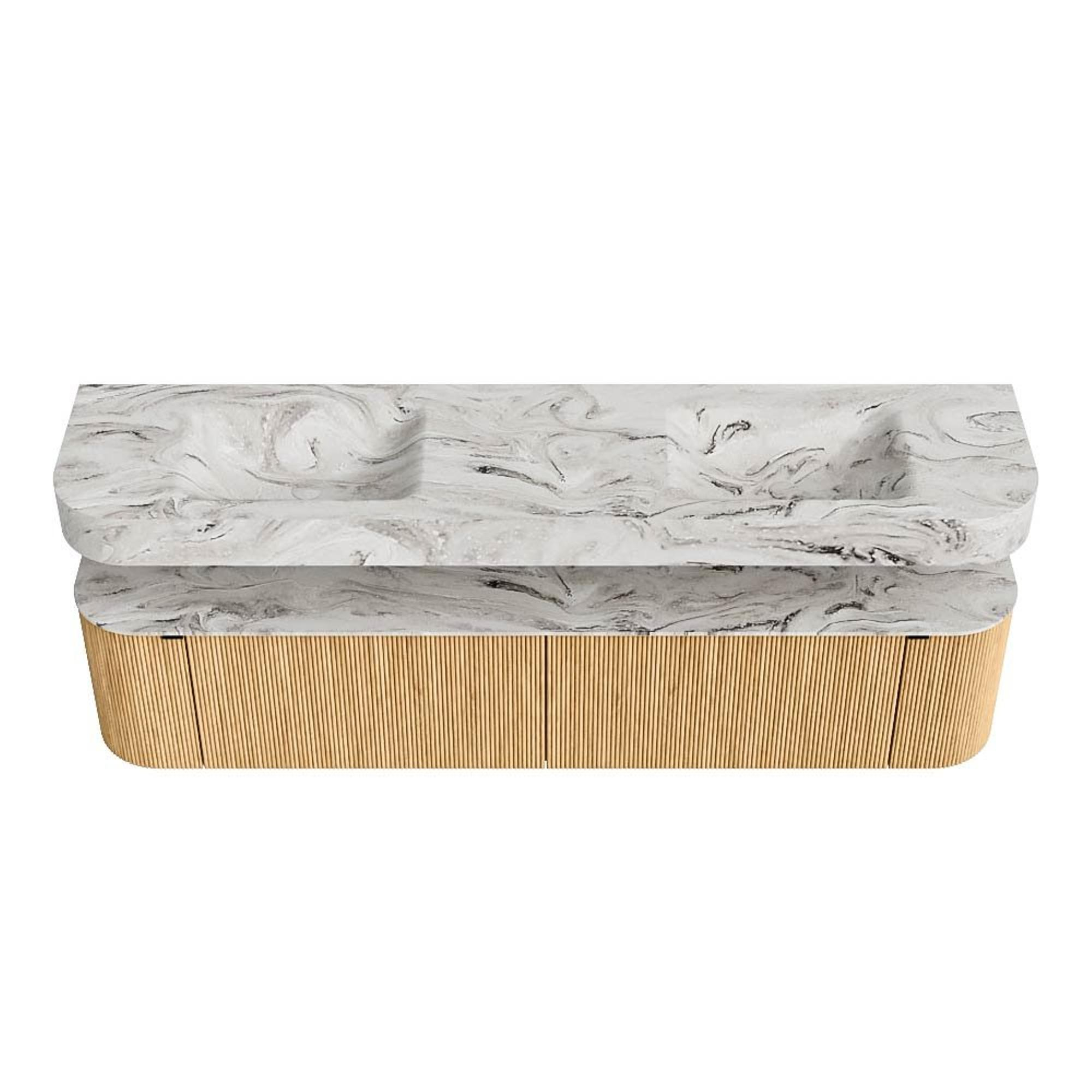 MONDIAZ THOR-DLUX 200cm badmeubel ronding links + rechts kleur Oak met 2 lades en 2 deuren. Vrijhangende wastafel CLOUD Dubbel 2 kraangaten kleur Glace.
