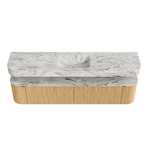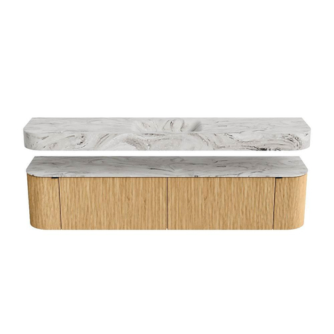 MONDIAZ THOR-DLUX 200cm badmeubel ronding links + rechts kleur Oak met 2 lades en 2 deuren. Vrijhangende wastafel CLOUD Midden zonder kraangat kleur Glace.