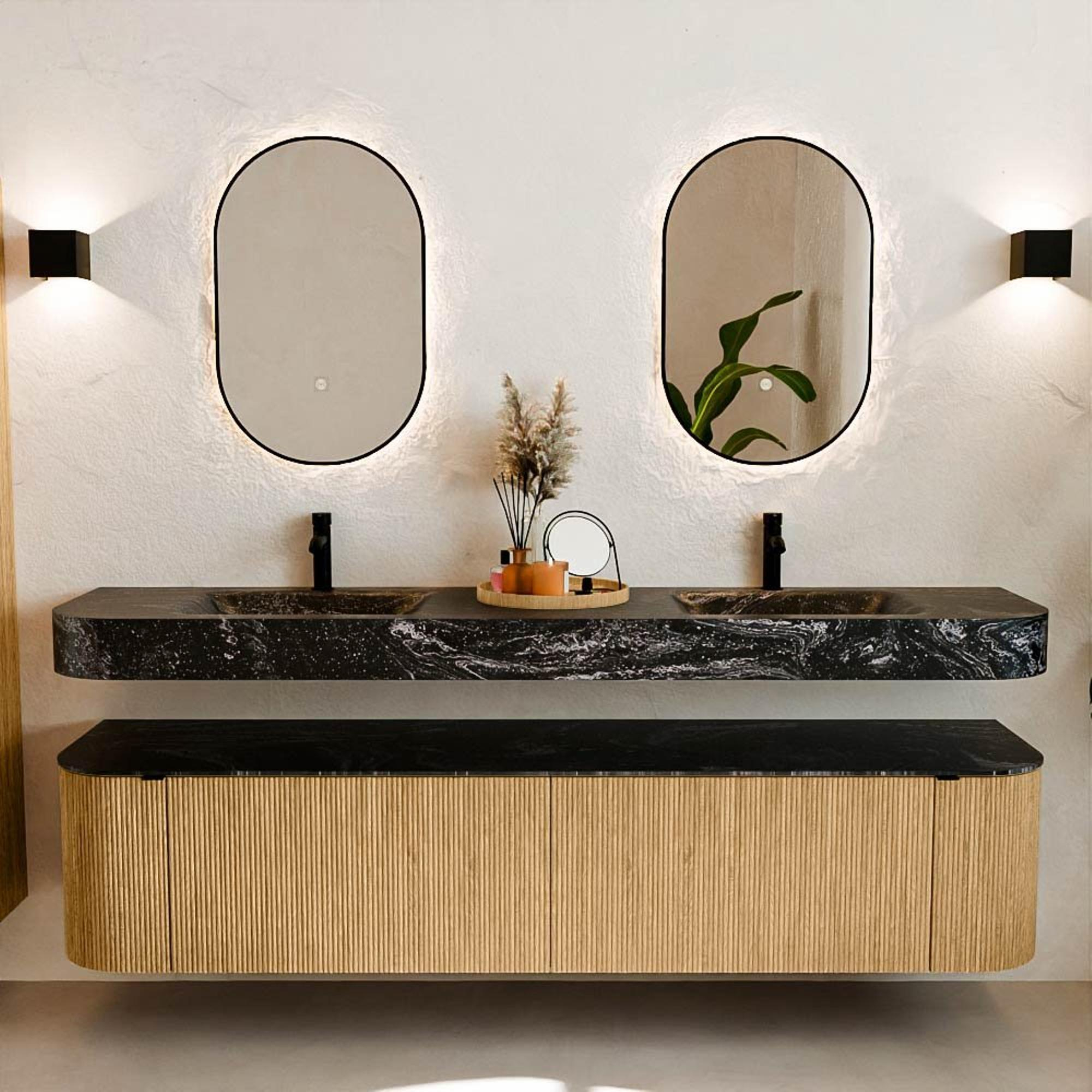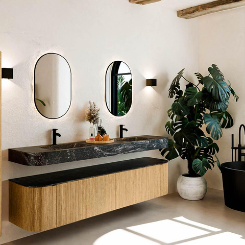 Natuurlijke materialen in warme tinten. De verticale ribbels brengen ritme en textuur in het ontwerp, terwijl het eikenhout zorgt voor een warme, ambachtelijke uitstraling. Kies uit 5 houttinten OAK, WALNUT, DUSK, SHADOW en RUBY zorgvuldig geselecteerde houtkleuren om zowel moderne als klassieke badkamers te verrijken.