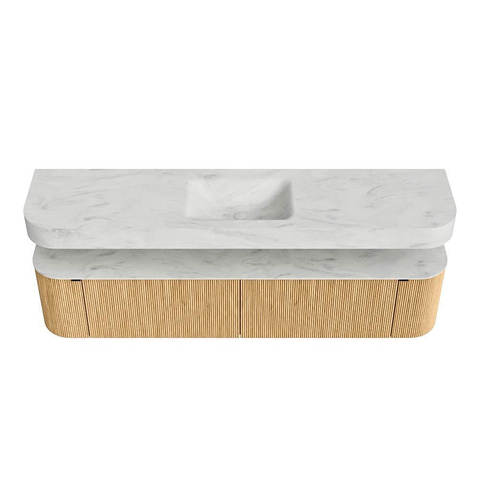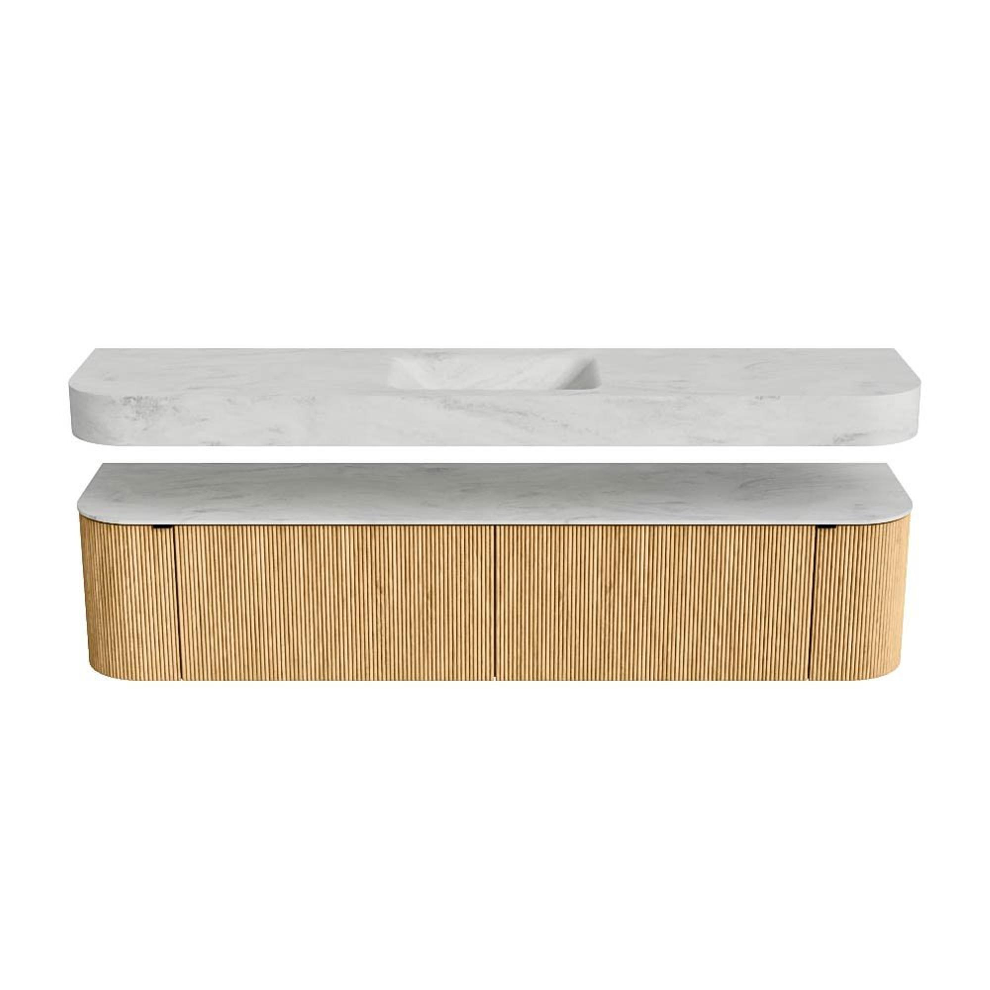 Boven het meubel zweeft een bijpassende, vrij hangende wastafel met afgeronde hoeken – perfect afgestemd op de vorm van de kast. De wastafel is uitgevoerd in Solid Surface en volgt subtiel de lijnen van het onderliggende meubel, waardoor een harmonieus geheel ontstaat. Het Solid Surface topblad vormt een sterke, onderhoudsvriendelijke basis en maakt de combinatie compleet.