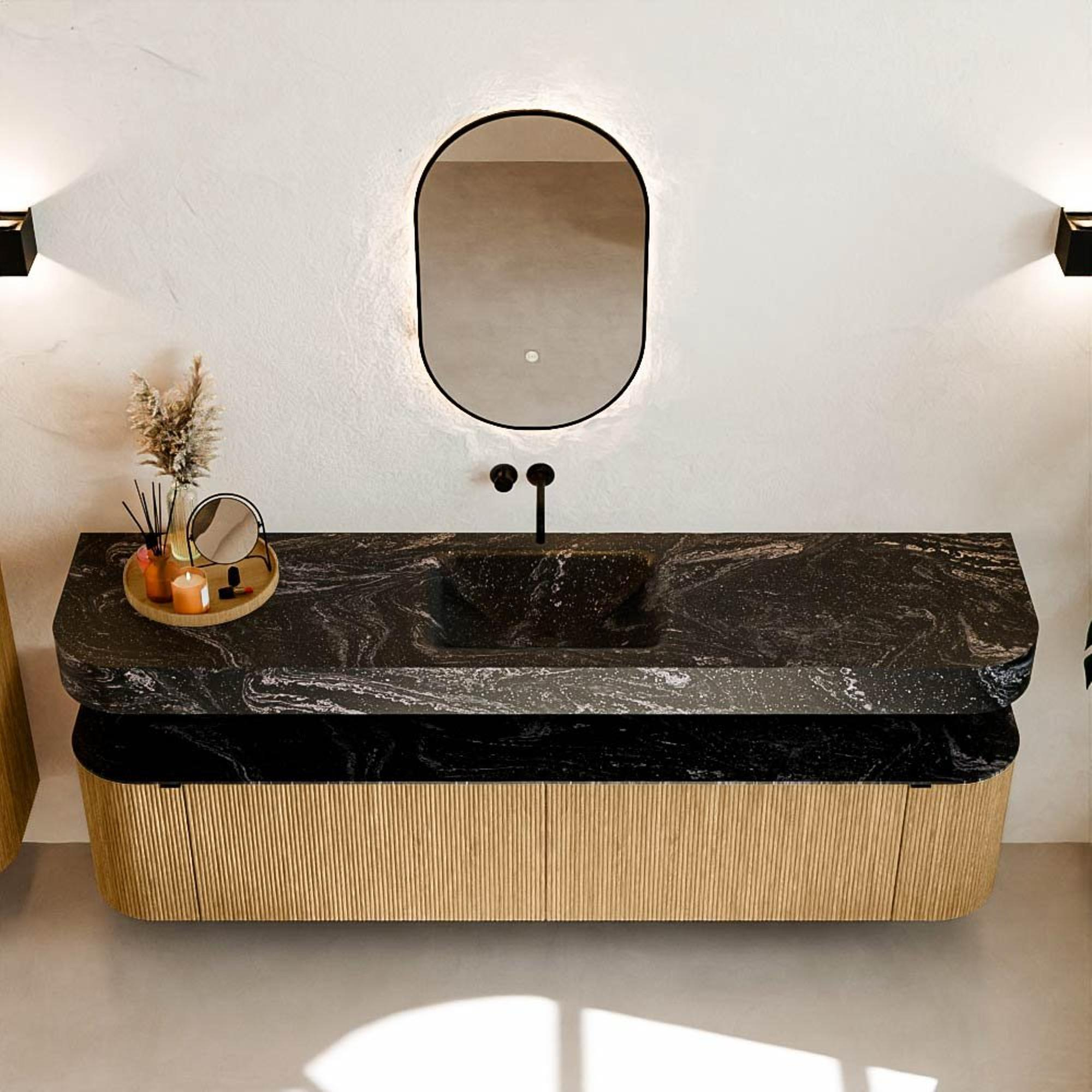 MONDIAZ THOR-DLUX 200cm badmeubel ronding links + rechts kleur Oak met 2 lades en 2 deuren. Vrijhangende wastafel CLOUD Midden zonder kraangat kleur Lava.