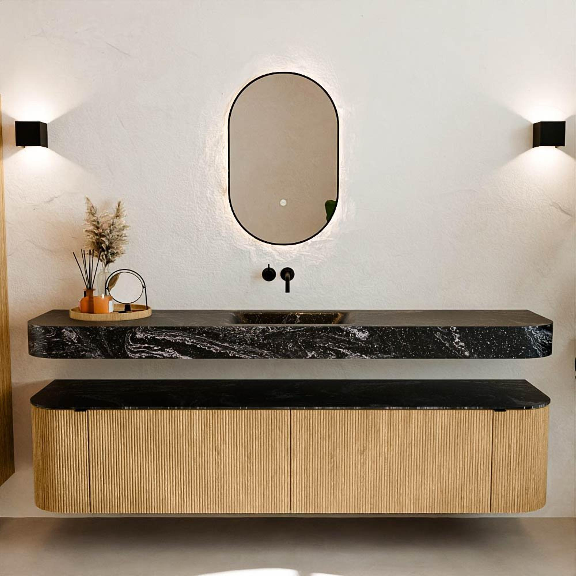 Natuurlijke materialen in warme tinten. De verticale ribbels brengen ritme en textuur in het ontwerp, terwijl het eikenhout zorgt voor een warme, ambachtelijke uitstraling. Kies uit 5 houttinten OAK, WALNUT, DUSK, SHADOW en RUBY zorgvuldig geselecteerde houtkleuren om zowel moderne als klassieke badkamers te verrijken.