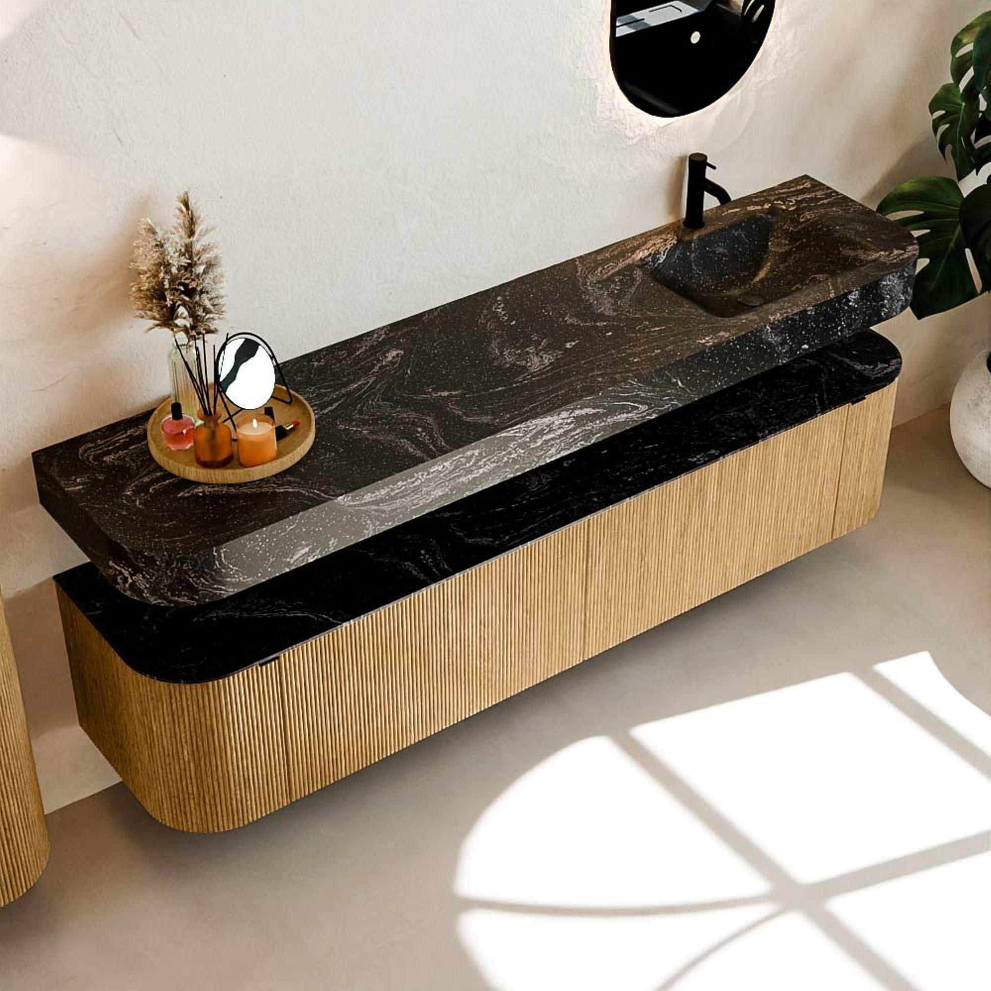 MONDIAZ THOR-DLUX 200cm badmeubel ronding links + rechts kleur Oak met 2 lades en 2 deuren. Vrijhangende wastafel CLOUD Rechts 1 kraangat kleur Lava.