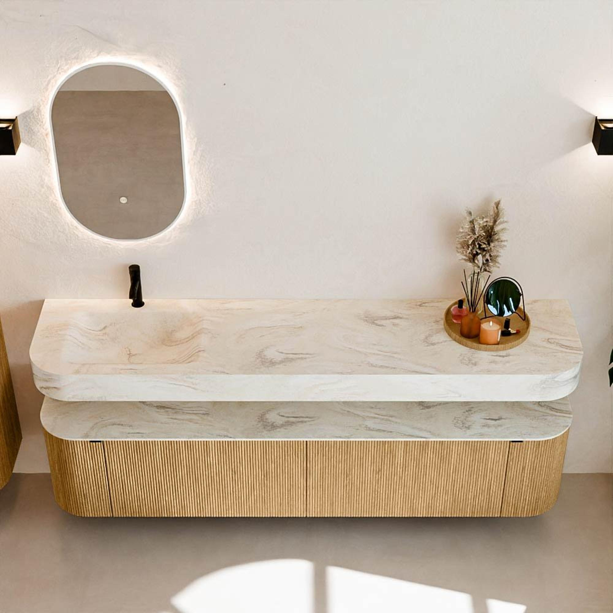 MONDIAZ THOR-DLUX 200cm badmeubel ronding links + rechts kleur Oak met 2 lades en 2 deuren. Vrijhangende wastafel CLOUD Links 1 kraangat kleur Ostra.
