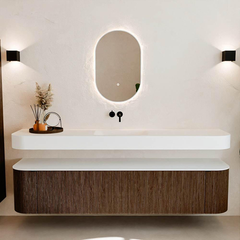 Boven het meubel zweeft een bijpassende, vrij hangende wastafel met afgeronde hoeken – perfect afgestemd op de vorm van de kast. De wastafel is uitgevoerd in Solid Surface en volgt subtiel de lijnen van het onderliggende meubel, waardoor een harmonieus geheel ontstaat. Het Solid Surface topblad vormt een sterke, onderhoudsvriendelijke basis en maakt de combinatie compleet.