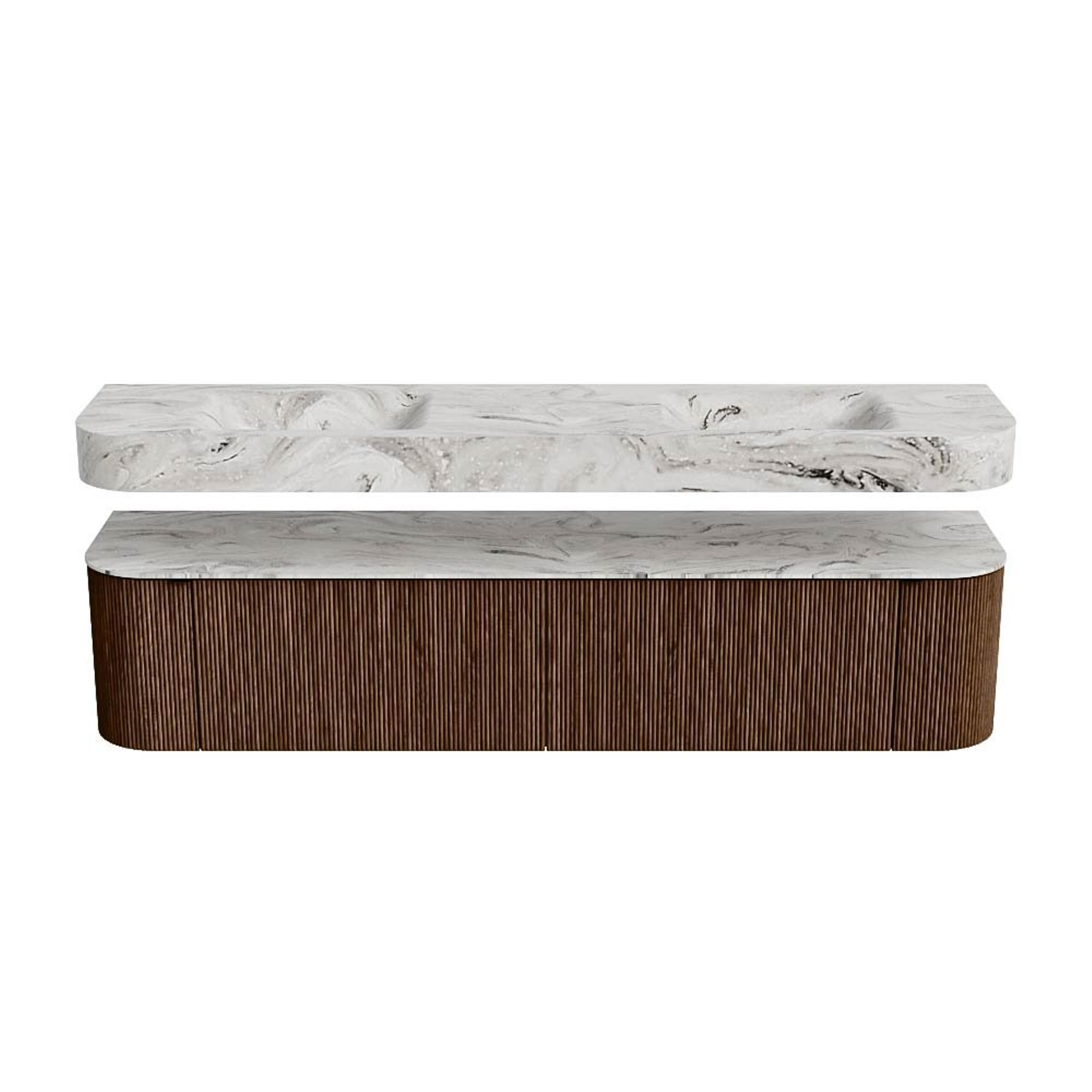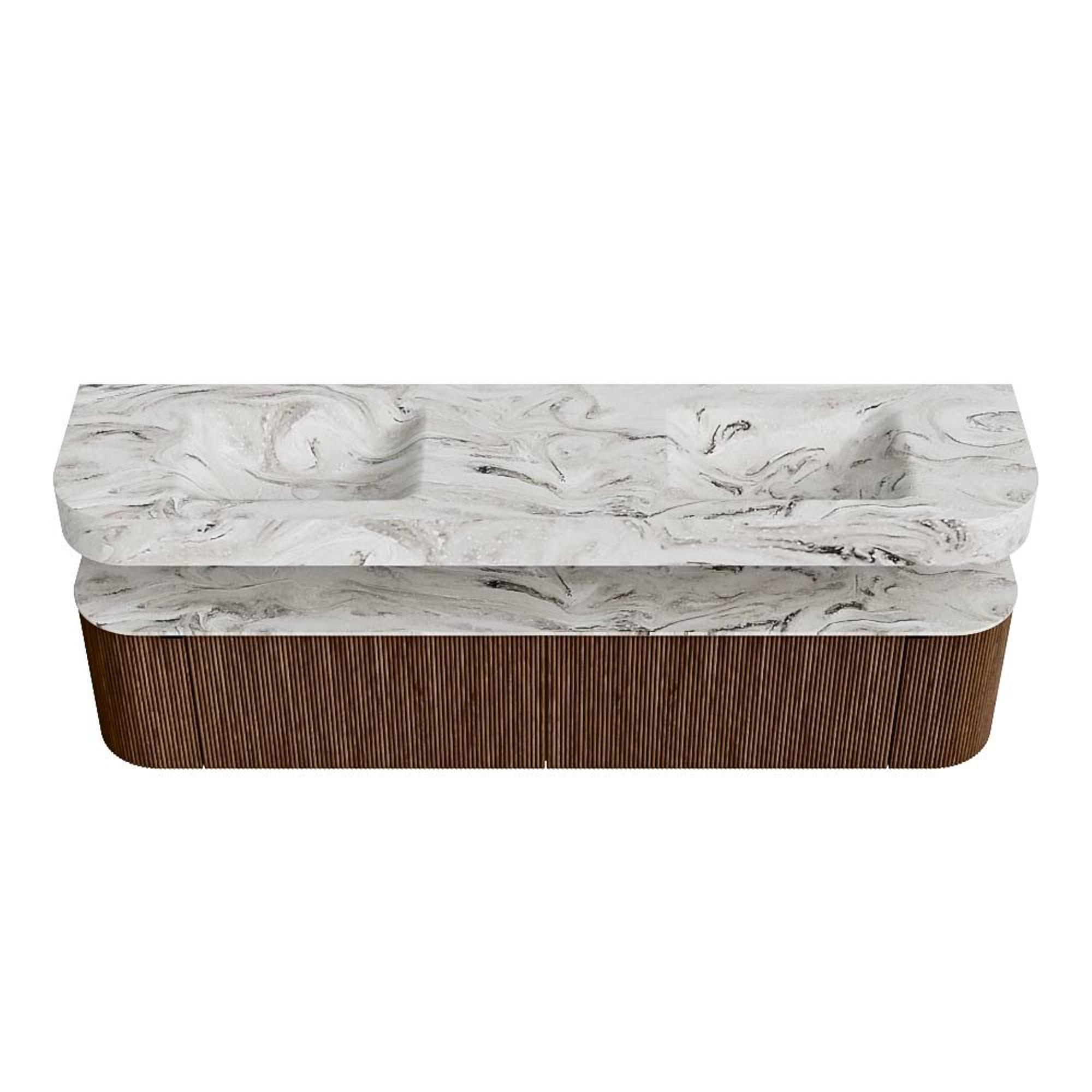 MONDIAZ THOR-DLUX 200cm badmeubel ronding links + rechts kleur Walnut met 2 lades en 2 deuren. Vrijhangende wastafel CLOUD Dubbel 2 kraangaten kleur Glace.