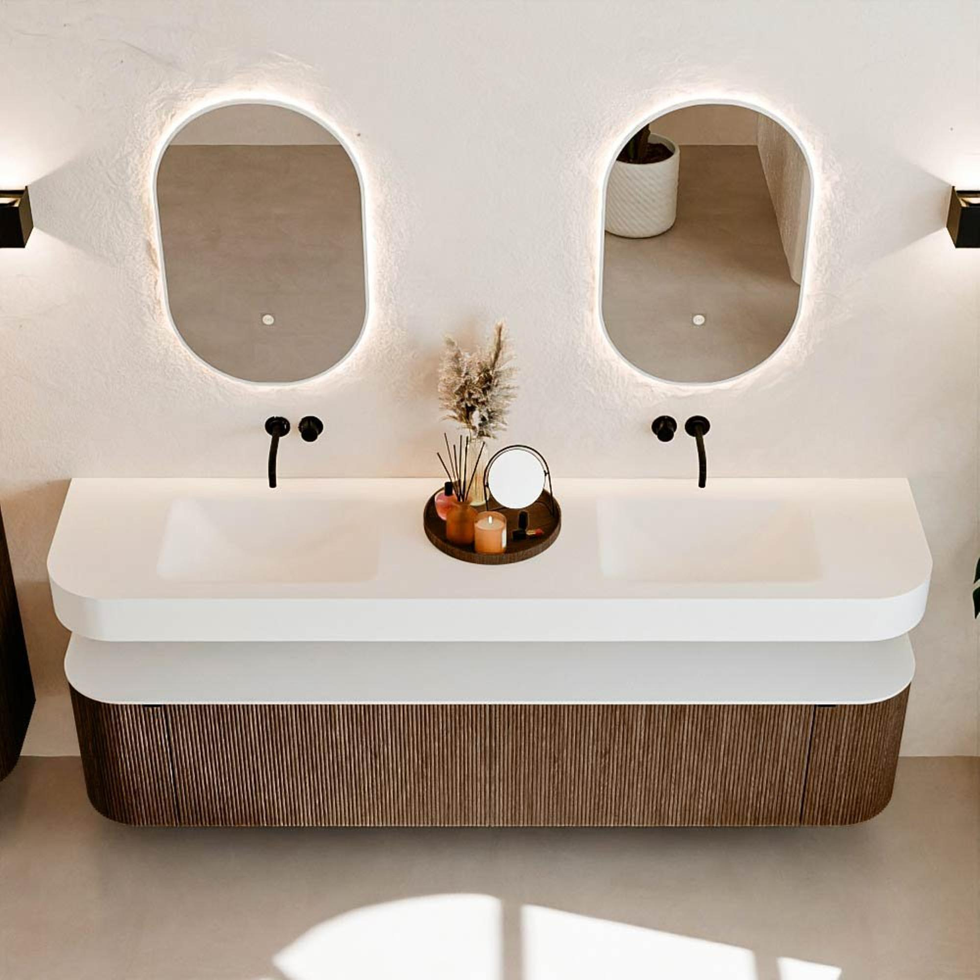 Natuurlijke materialen in warme tinten. De verticale ribbels brengen ritme en textuur in het ontwerp, terwijl het eikenhout zorgt voor een warme, ambachtelijke uitstraling. Kies uit 5 houttinten OAK, WALNUT, DUSK, SHADOW en RUBY zorgvuldig geselecteerde houtkleuren om zowel moderne als klassieke badkamers te verrijken.
