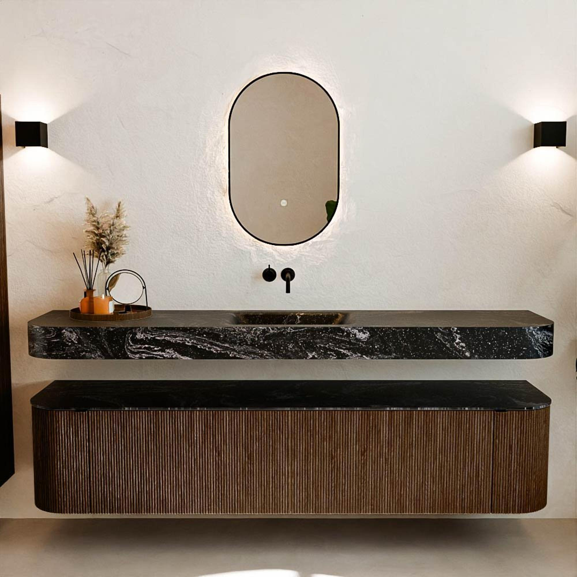 Natuurlijke materialen in warme tinten. De verticale ribbels brengen ritme en textuur in het ontwerp, terwijl het eikenhout zorgt voor een warme, ambachtelijke uitstraling. Kies uit 5 houttinten OAK, WALNUT, DUSK, SHADOW en RUBY zorgvuldig geselecteerde houtkleuren om zowel moderne als klassieke badkamers te verrijken.