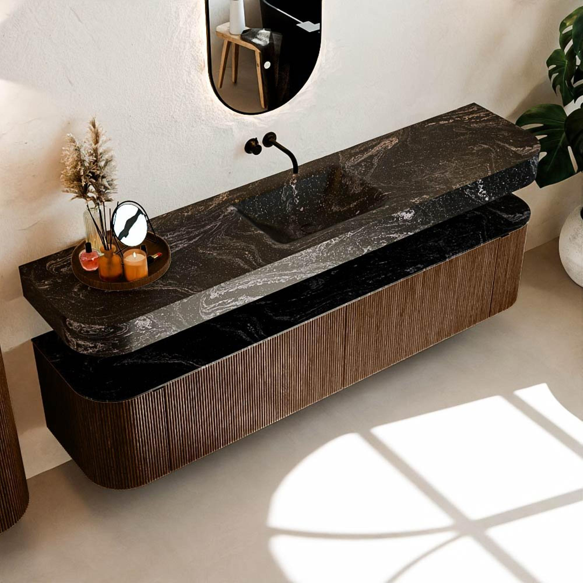 MONDIAZ THOR-DLUX 200cm badmeubel ronding links + rechts kleur Walnut met 2 lades en 2 deuren. Vrijhangende wastafel CLOUD Midden zonder kraangat kleur Lava.