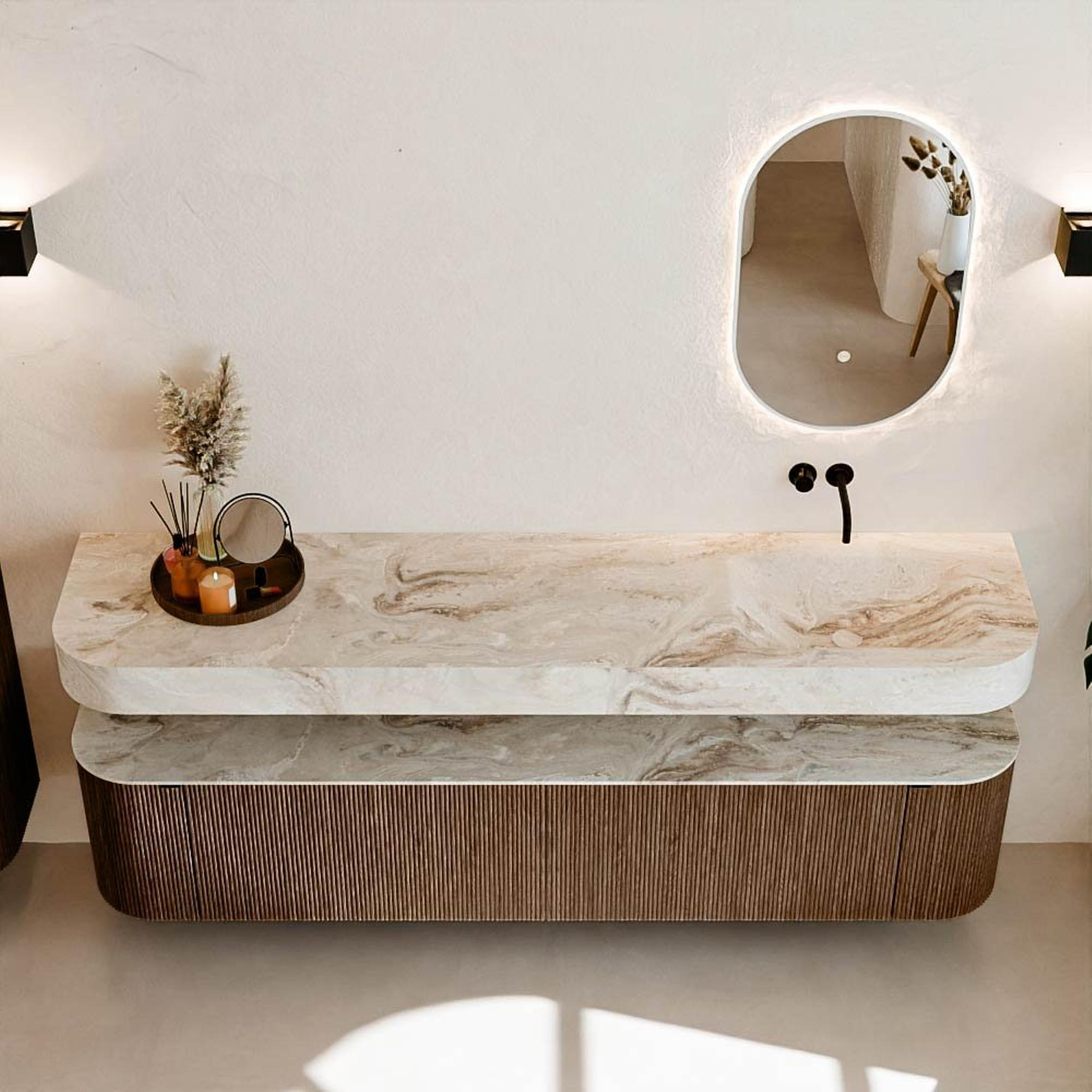 MONDIAZ THOR-DLUX 200cm badmeubel ronding links + rechts kleur Walnut met 2 lades en 2 deuren. Vrijhangende wastafel CLOUD Rechts zonder kraangat kleur Frappe.