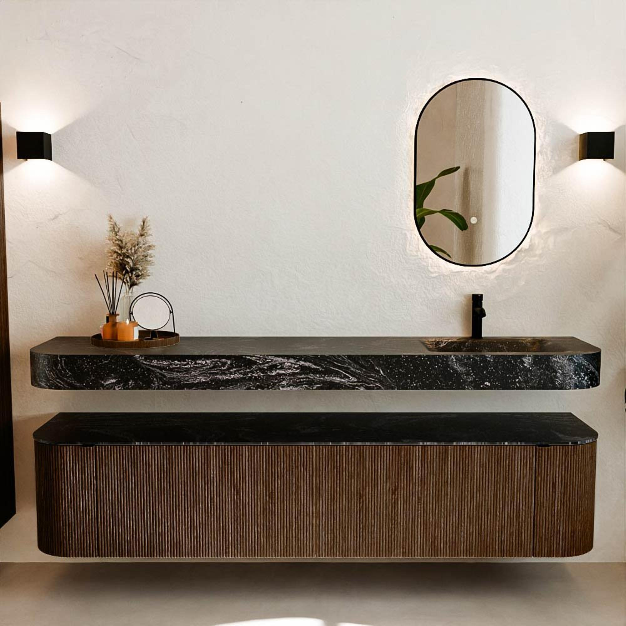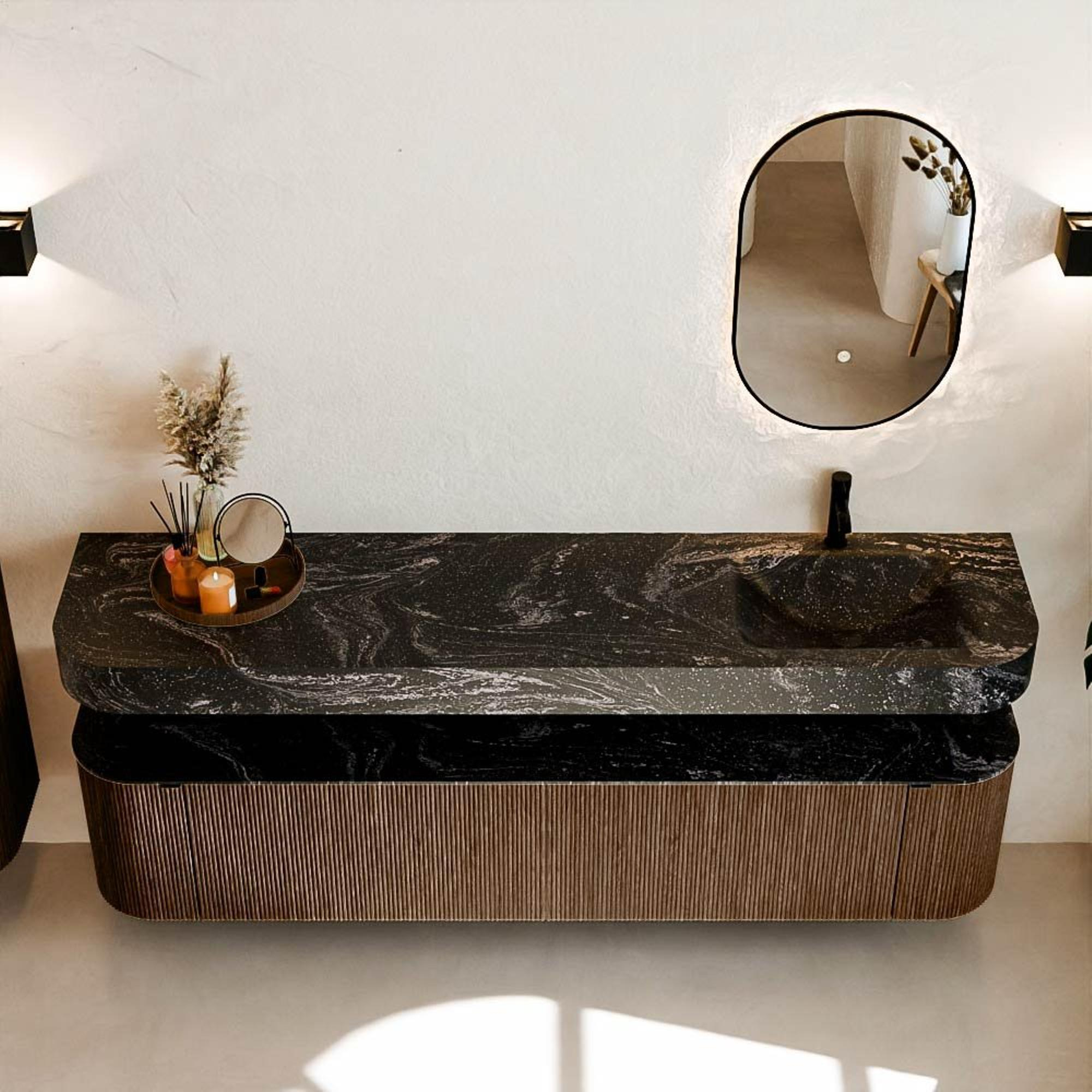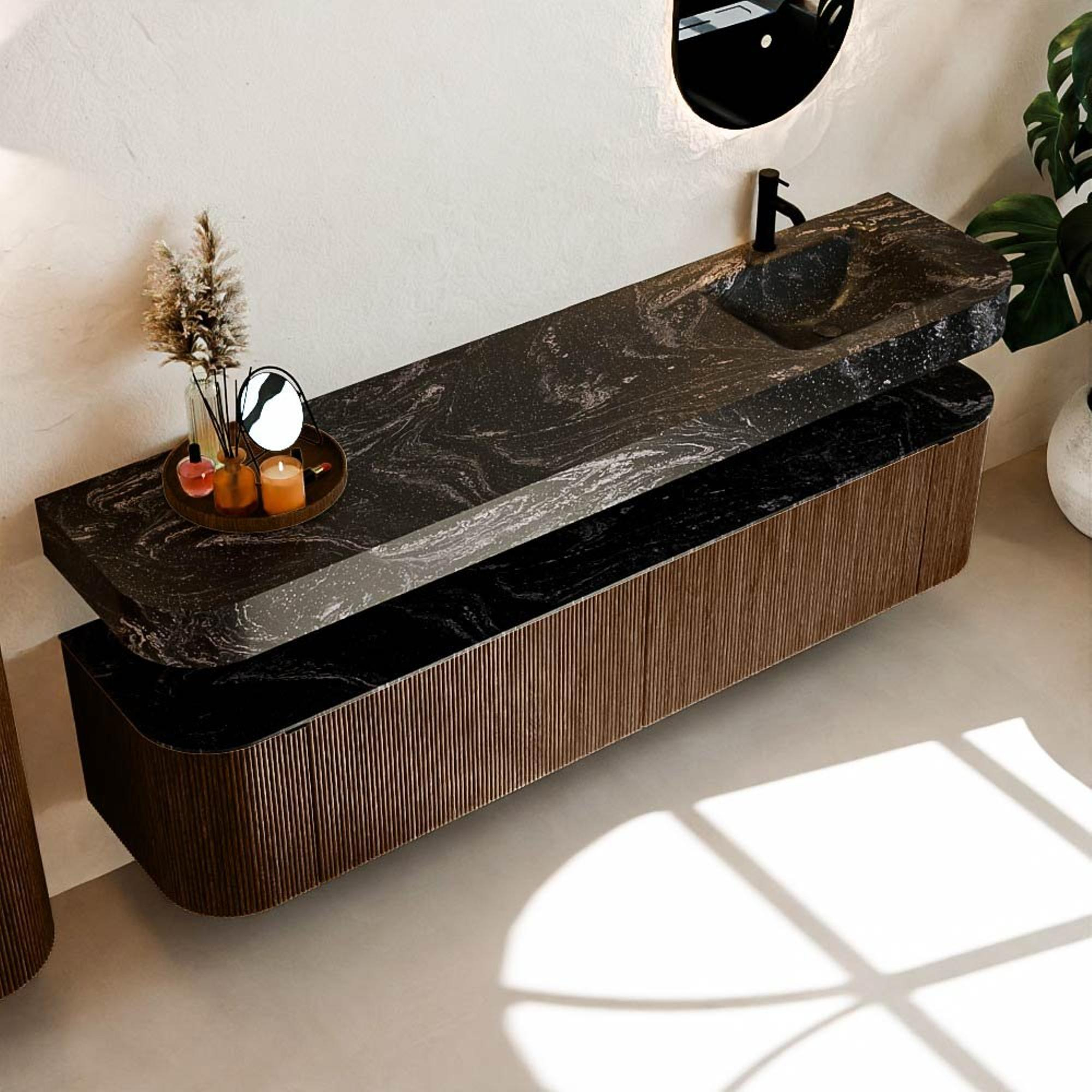 MONDIAZ THOR-DLUX 200cm badmeubel ronding links + rechts kleur Walnut met 2 lades en 2 deuren. Vrijhangende wastafel CLOUD Rechts 1 kraangat kleur Lava.