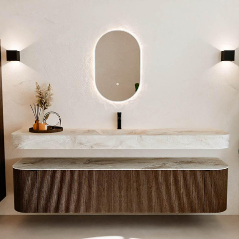 MONDIAZ THOR-DLUX 200cm badmeubel ronding links + rechts kleur Walnut met 2 lades en 2 deuren. Vrijhangende wastafel CLOUD Midden 1 kraangat kleur Frappe.