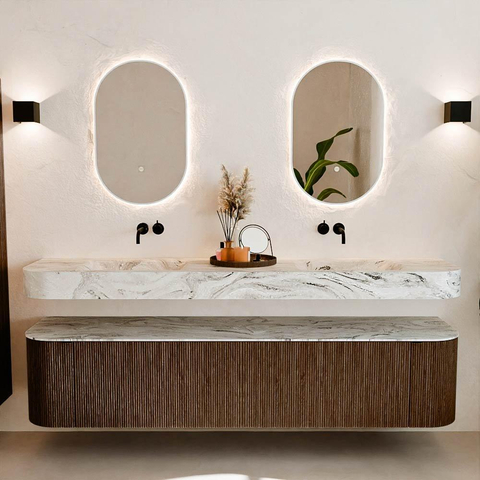 MONDIAZ THOR-DLUX 200cm badmeubel ronding links + rechts kleur Walnut met 2 lades en 2 deuren. Vrijhangende wastafel CLOUD Dubbel zonder kraangat kleur Glace.