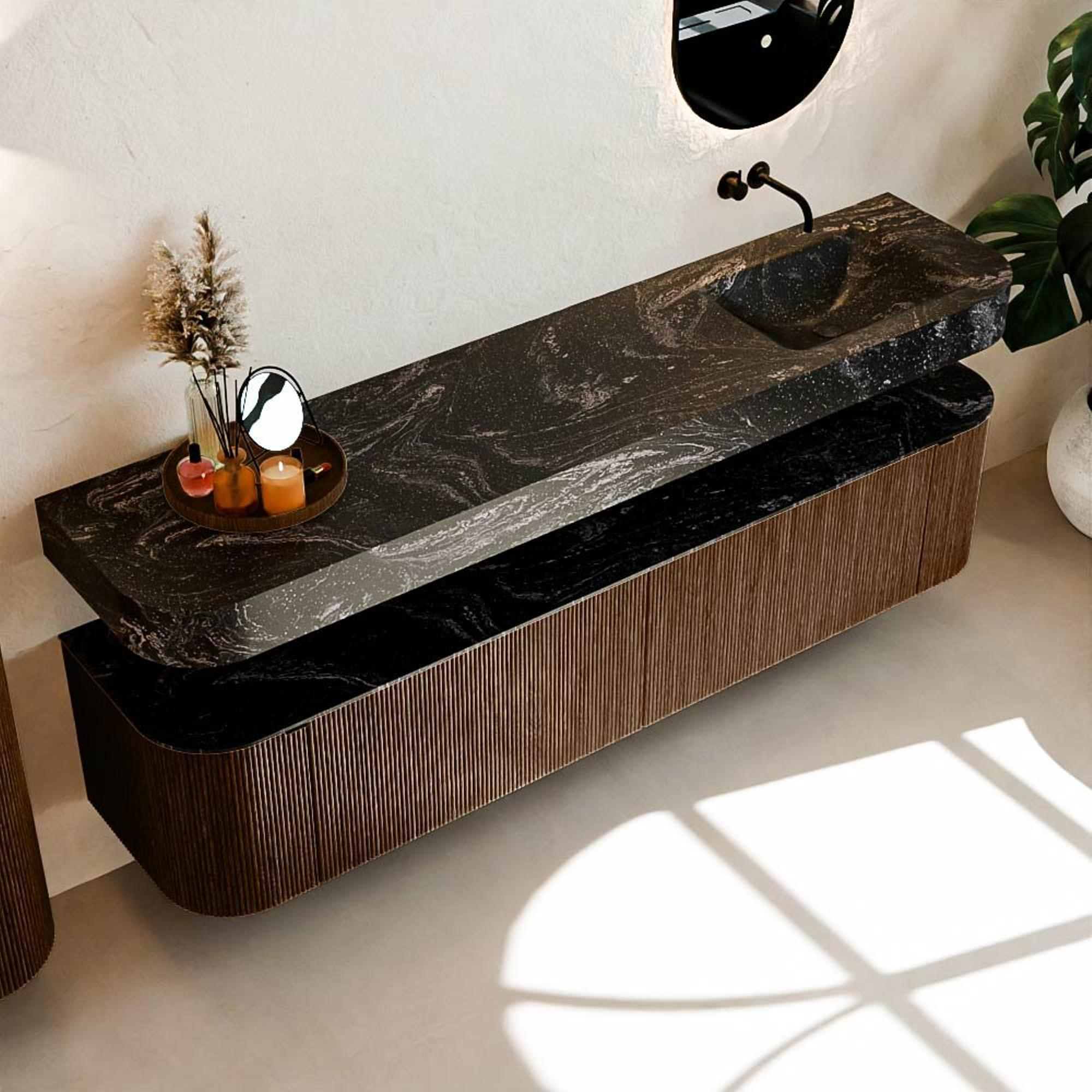 MONDIAZ THOR-DLUX 200cm badmeubel ronding links + rechts kleur Walnut met 2 lades en 2 deuren. Vrijhangende wastafel CLOUD Rechts zonder kraangat kleur Lava.